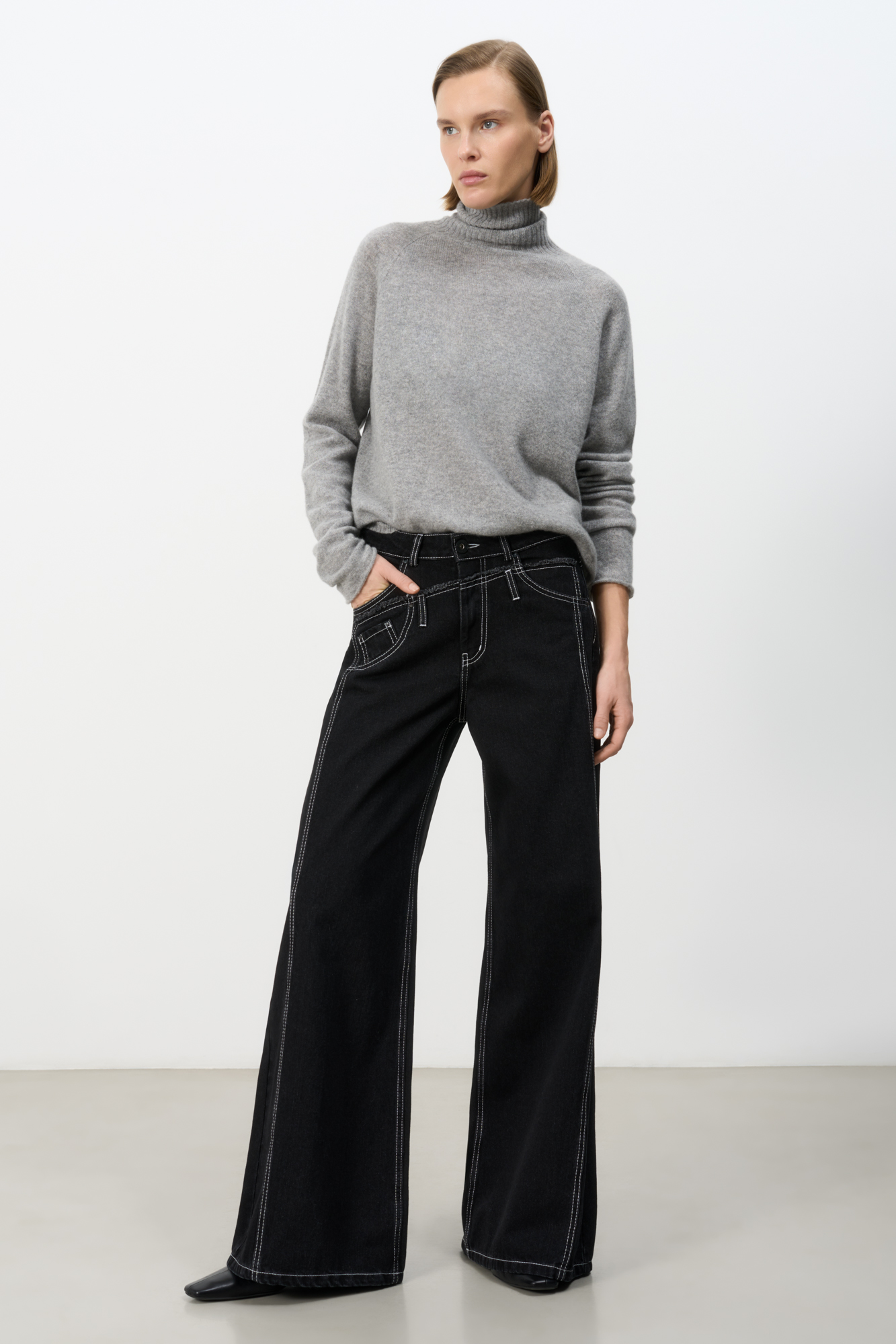 Джинсы с асимметричной деталью на поясе в виде второго яруса. Модель прямого кроя с небольшим расклешением. Пять карманов. Застежка на молнию и металлическую пуговицу.