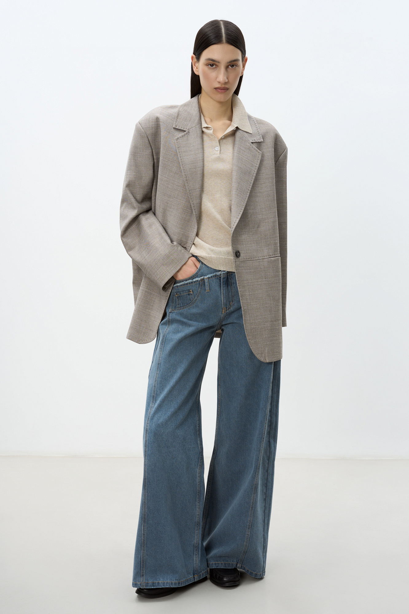 Джинсы с асимметричной деталью на поясе в виде второго яруса. Модель прямого кроя с небольшим расклешением. Пять карманов. Застежка на молнию и металлическую пуговицу.