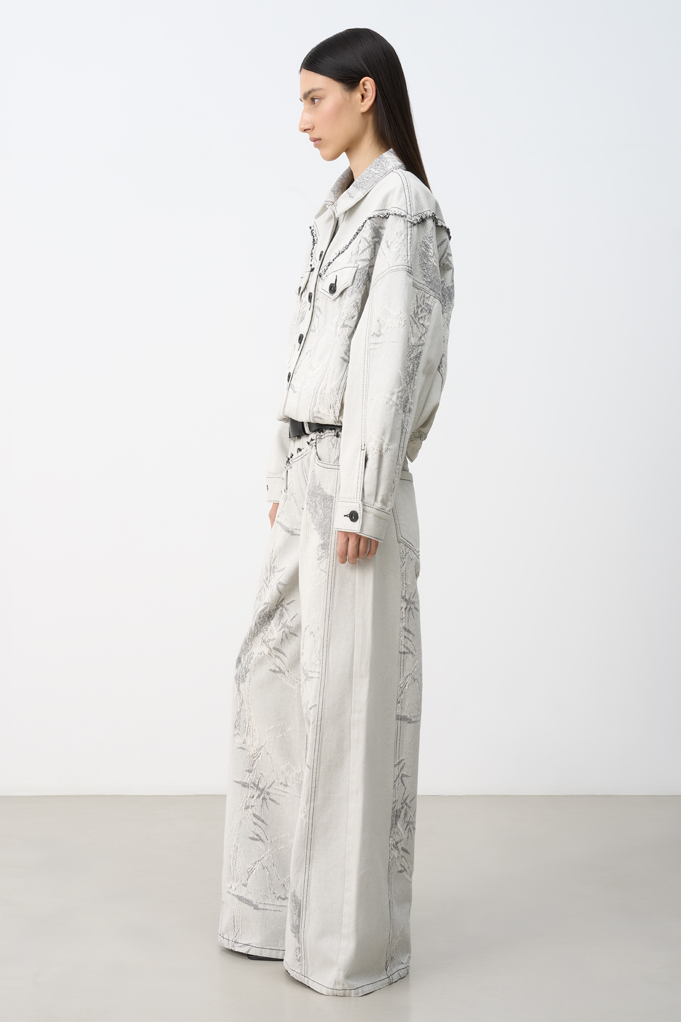 Расклешенные джинсы с принтом журавлей и ветвей бамбука. Модель с асимметричной деталью на поясе в виде второго яруса. Пять карманов. Застежка на молнию и металлическую пуговицу. Шлевки на поясе для ремня. Дополнить образ можно курткой в таком же стиле.