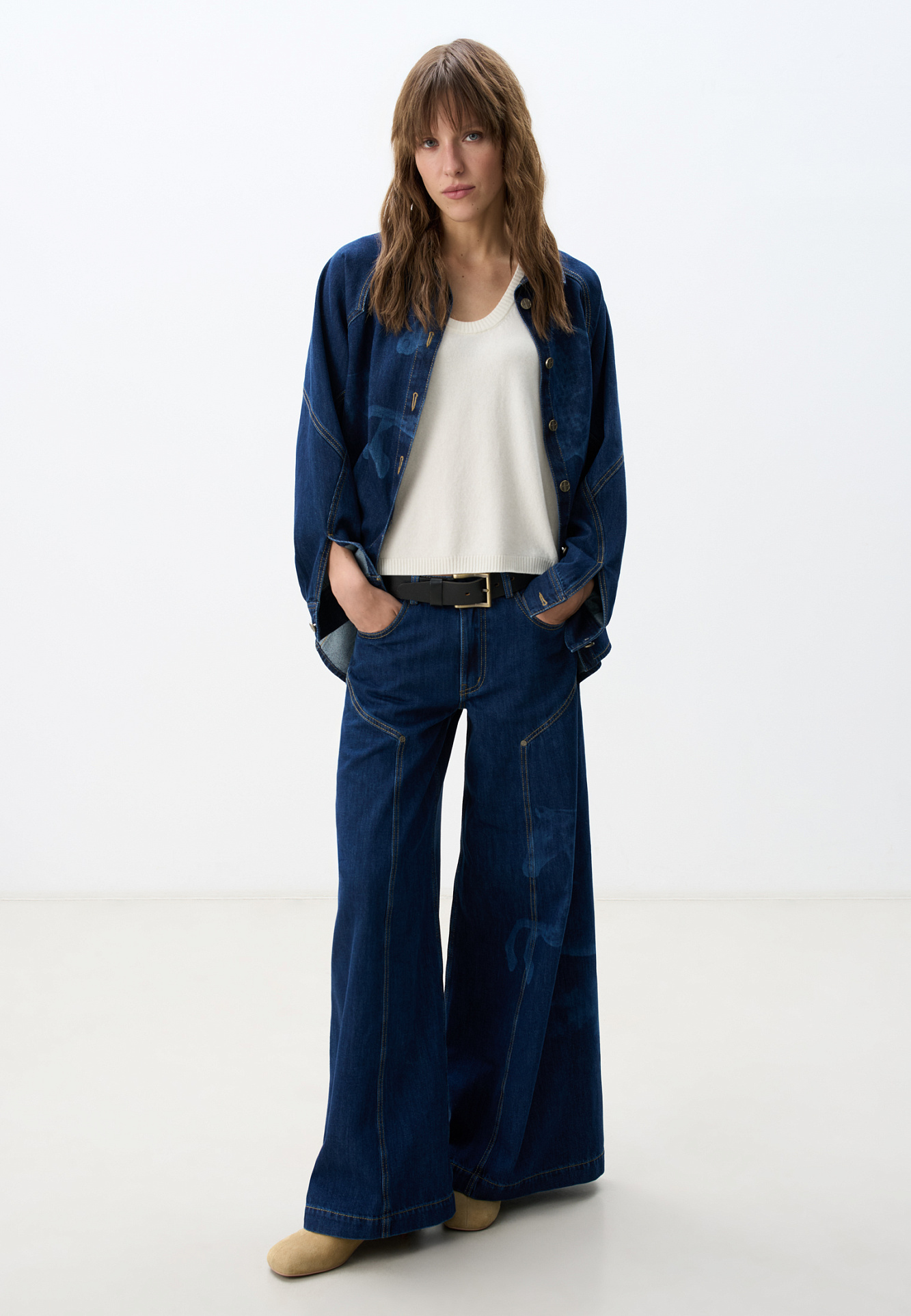 Широкие джинсы из 100% хлопка с принтом лошадей. Модель на средней посадке, с пятью карманами и шлевками на поясе для ремня. Застежка на молнию и пуговицу. На штанинах изделие декорировано принтом лошадей, выполненным лазером, и объемными геометрическими вытачками с заклепками.