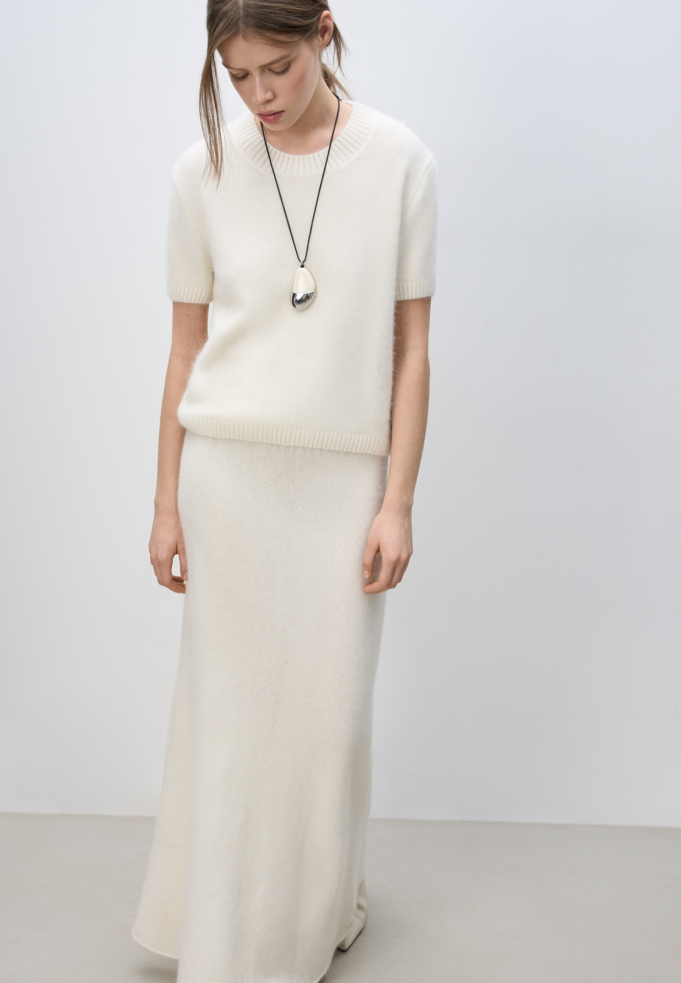 Трикотажная футболка из пуха лисы. Модель свободного силуэта, с коротким рукавом и круглым вырезом горловины. Края изделия выполнены в рубчик. Дополнить образ можно юбкой.