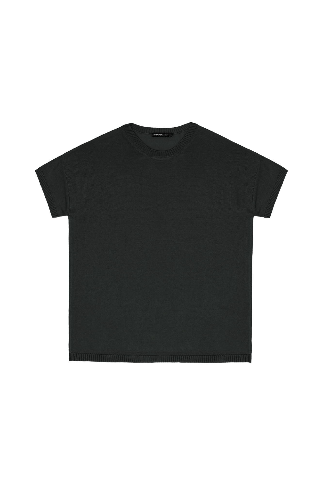 Цельновязаная футболка из 100% вискозы. Модель свободного силуэта, со спущенной линией плеча и круглым вырезом горловины. Края изделия выполнены в рубчик.