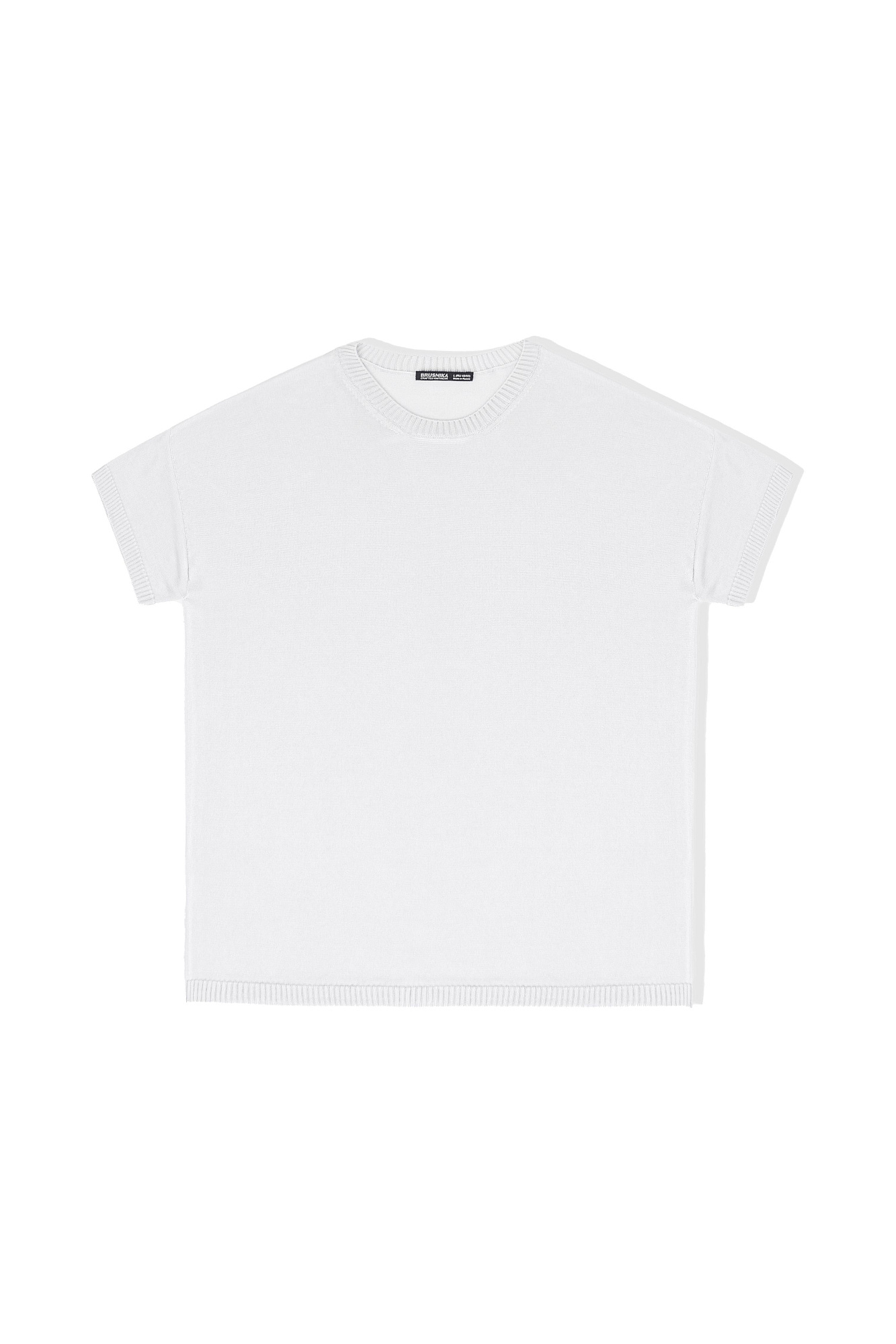 Цельновязаная футболка из 100% вискозы. Модель свободного силуэта, со спущенной линией плеча и круглым вырезом горловины. Края изделия выполнены в рубчик.