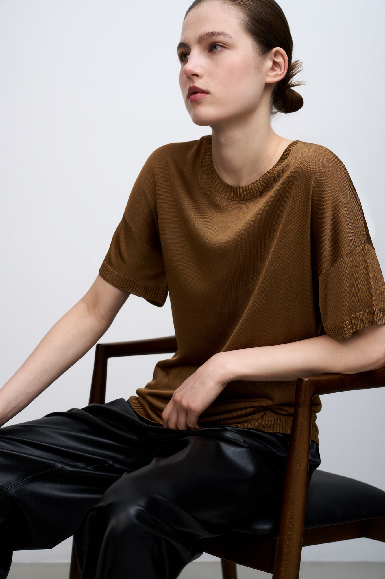 Цельновязаная футболка из 100% вискозы. Модель свободного силуэта, со спущенной линией плеча и круглым вырезом горловины. Края изделия выполнены в рубчик.