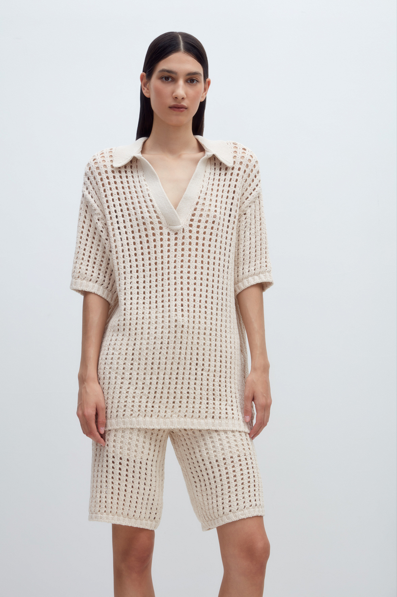 Трикотажная ажурная футболка из 100% хлопка. Модель со спущенным рукавом и воротником-поло. Дополнить образ можно шортами в таком же стиле.