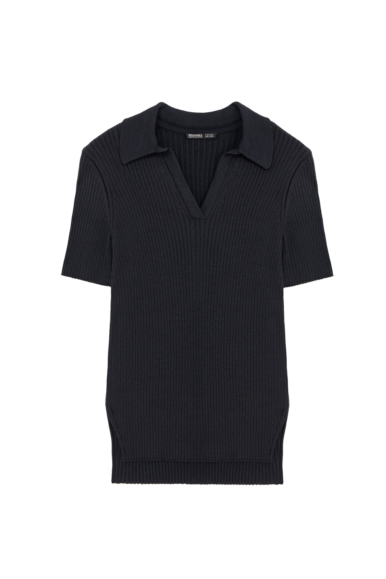 Трикотажная футболка в широкий рубчик с удлиненной спинкой и боковыми разрезами. Модель с отложным воротником и V-образным вырезом.