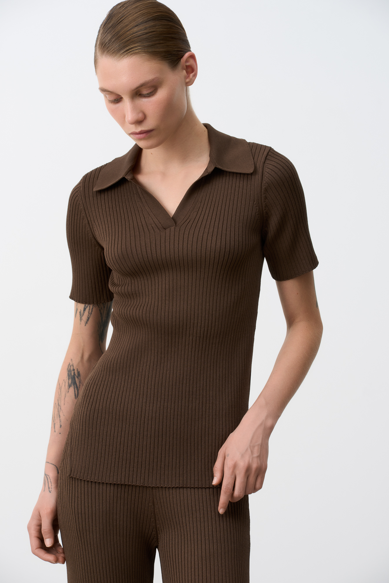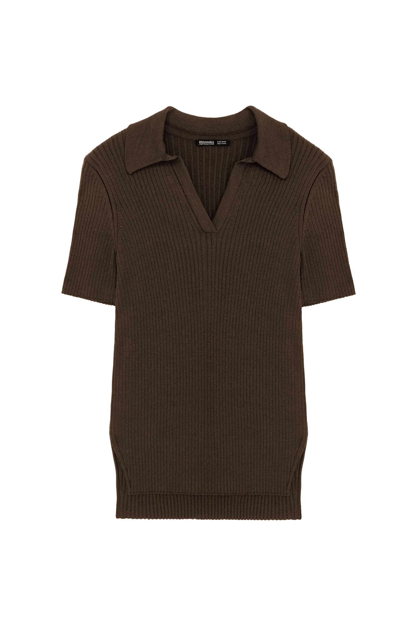 Трикотажная футболка в широкий рубчик с удлиненной спинкой и боковыми разрезами. Модель с отложным воротником и V-образным вырезом.
