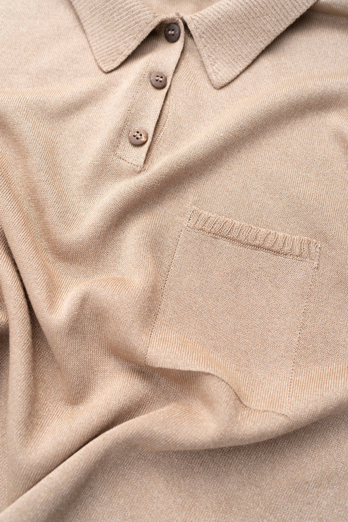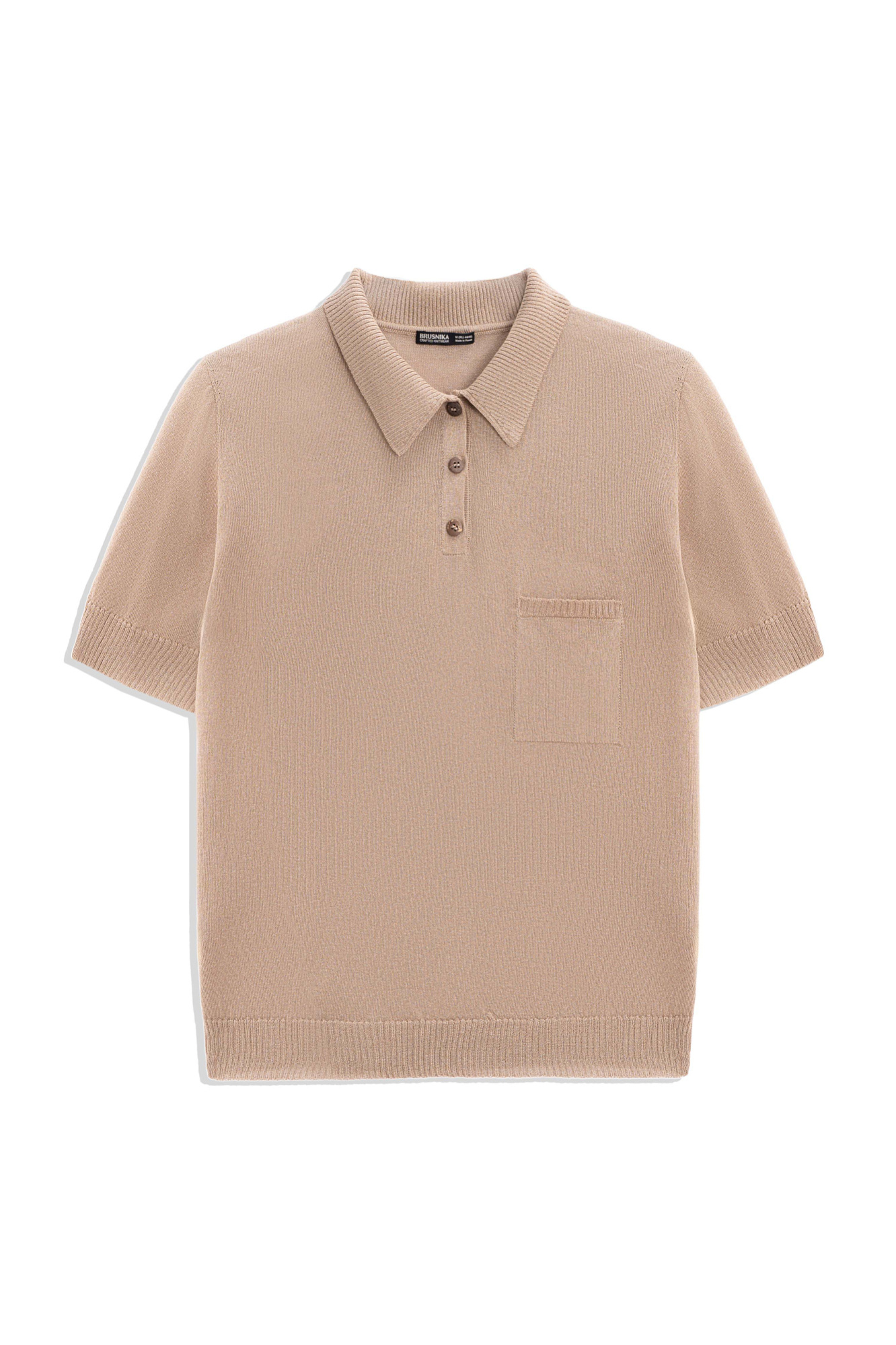 Трикотажное поло прямого кроя с коротким рукавом и накладным карманом на груди. Края изделия в рубчик.