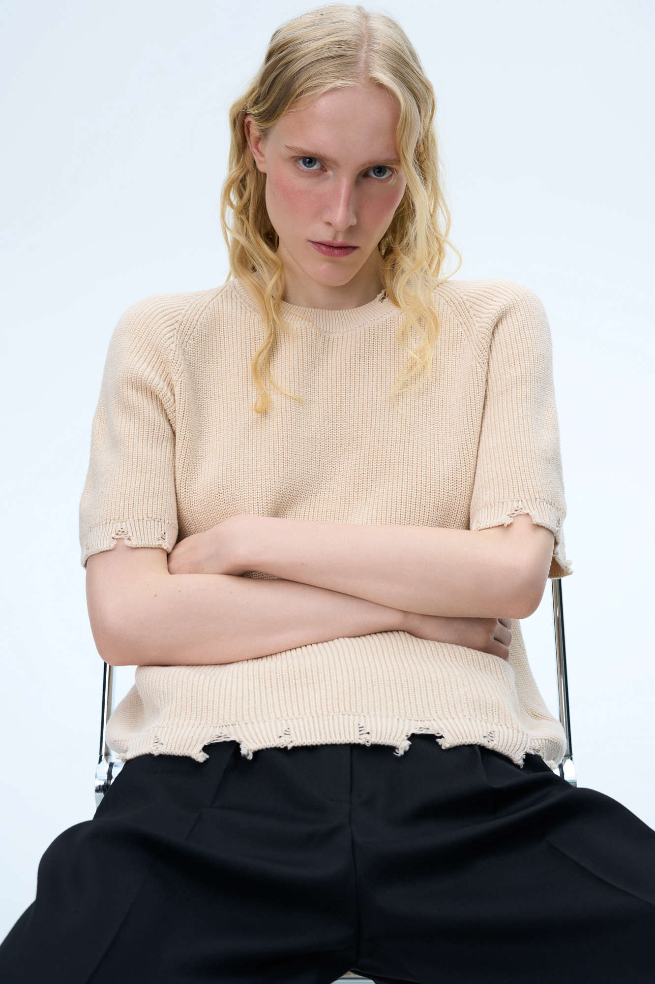 Трикотажная футболка из 100% хлопка. Модель свободного силуэта, со спущенной линией плеча, коротким рукавом и брендированным ярлыком на рукаве. Имитация необработанного края по низу изделия, на манжетах и воротнике.