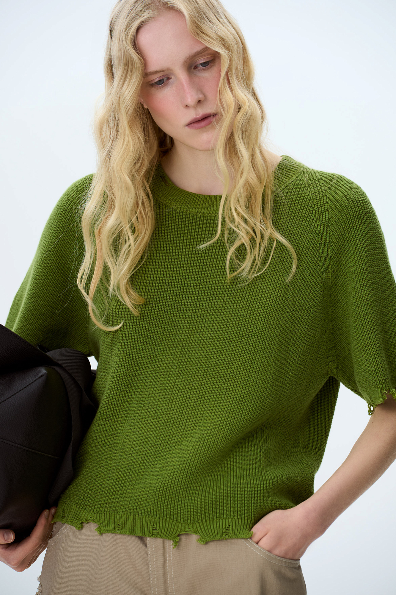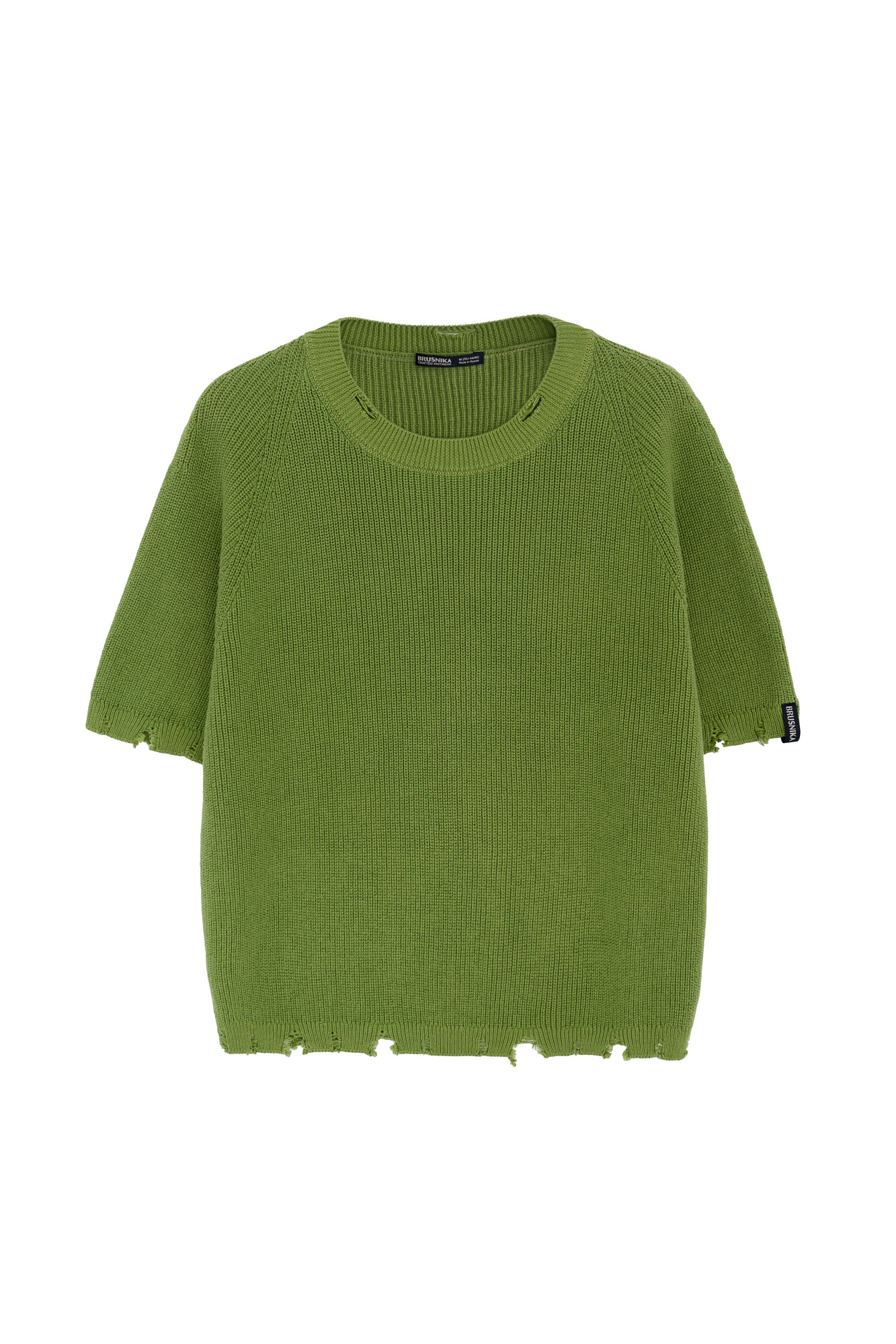 Трикотажная футболка из 100% хлопка. Модель свободного силуэта, со спущенной линией плеча, коротким рукавом и брендированным ярлыком на рукаве. Имитация необработанного края по низу изделия, на манжетах и воротнике.