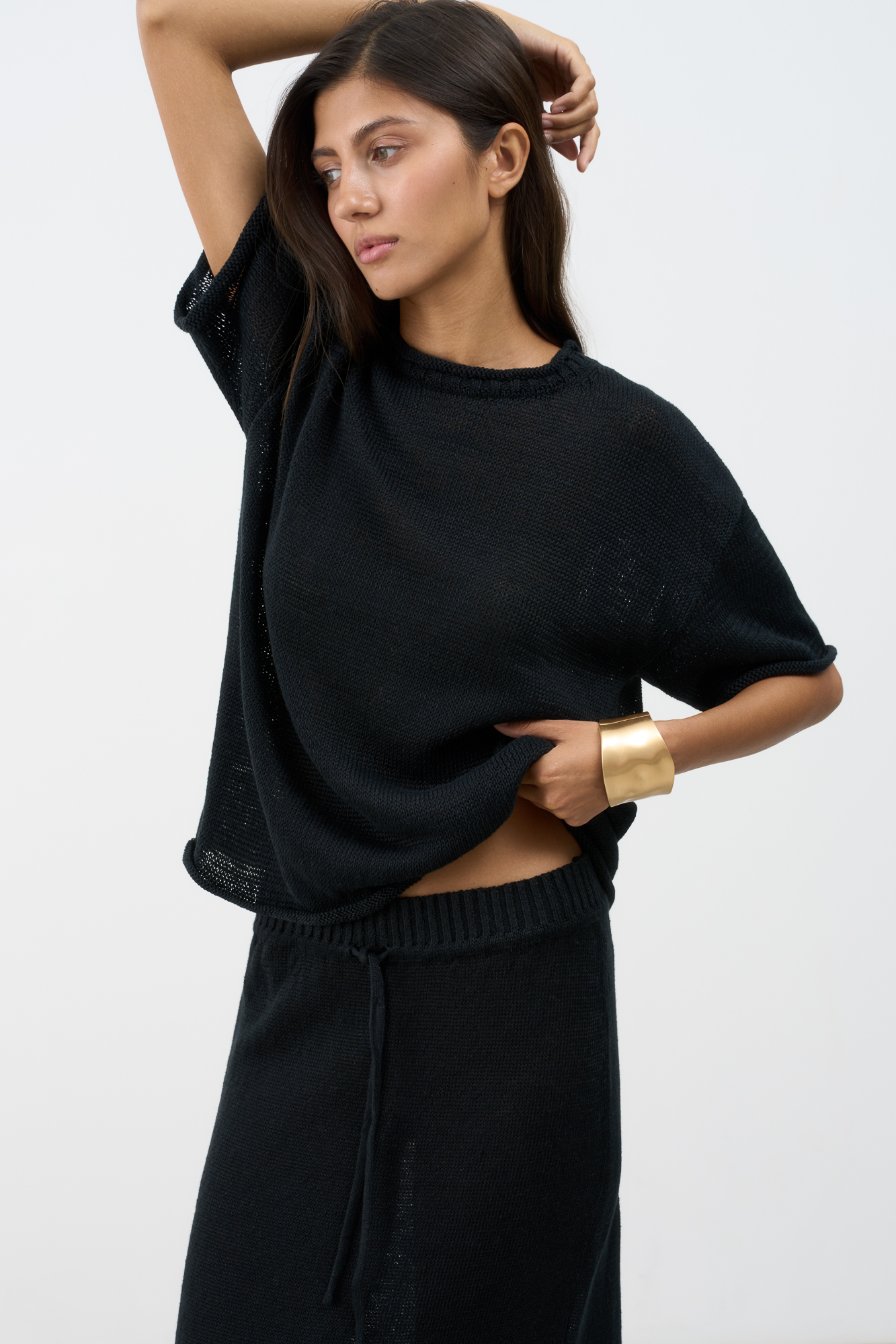 Трикотажная футболка из 100% льна. Модель свободного силуэта со спущенной линией плеча, коротким рукавом и круглымм вырезом горловины.