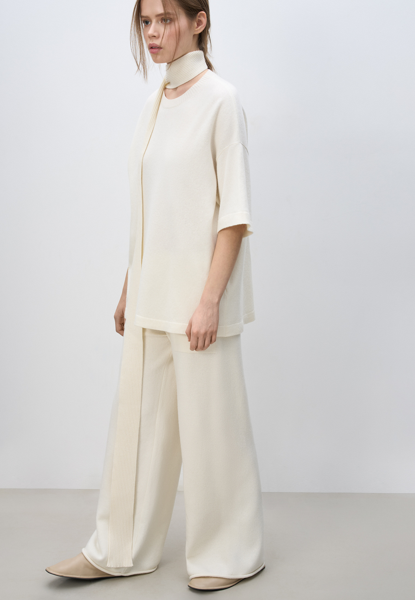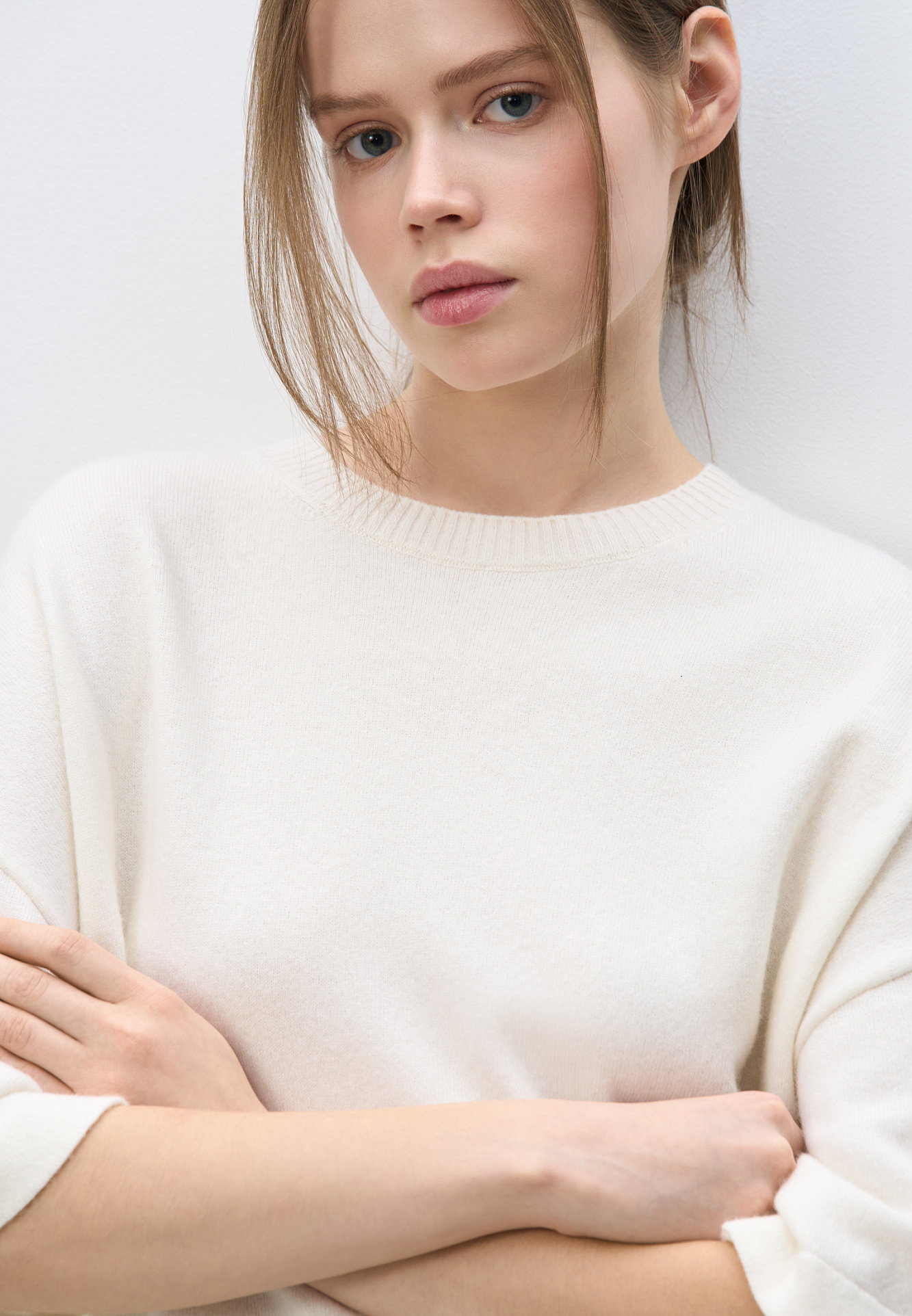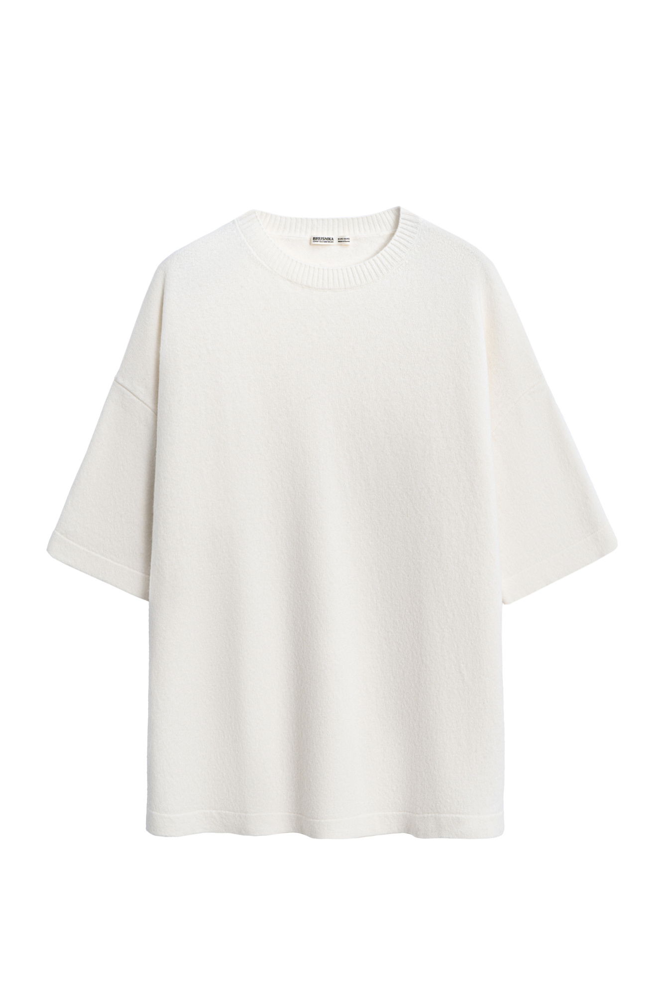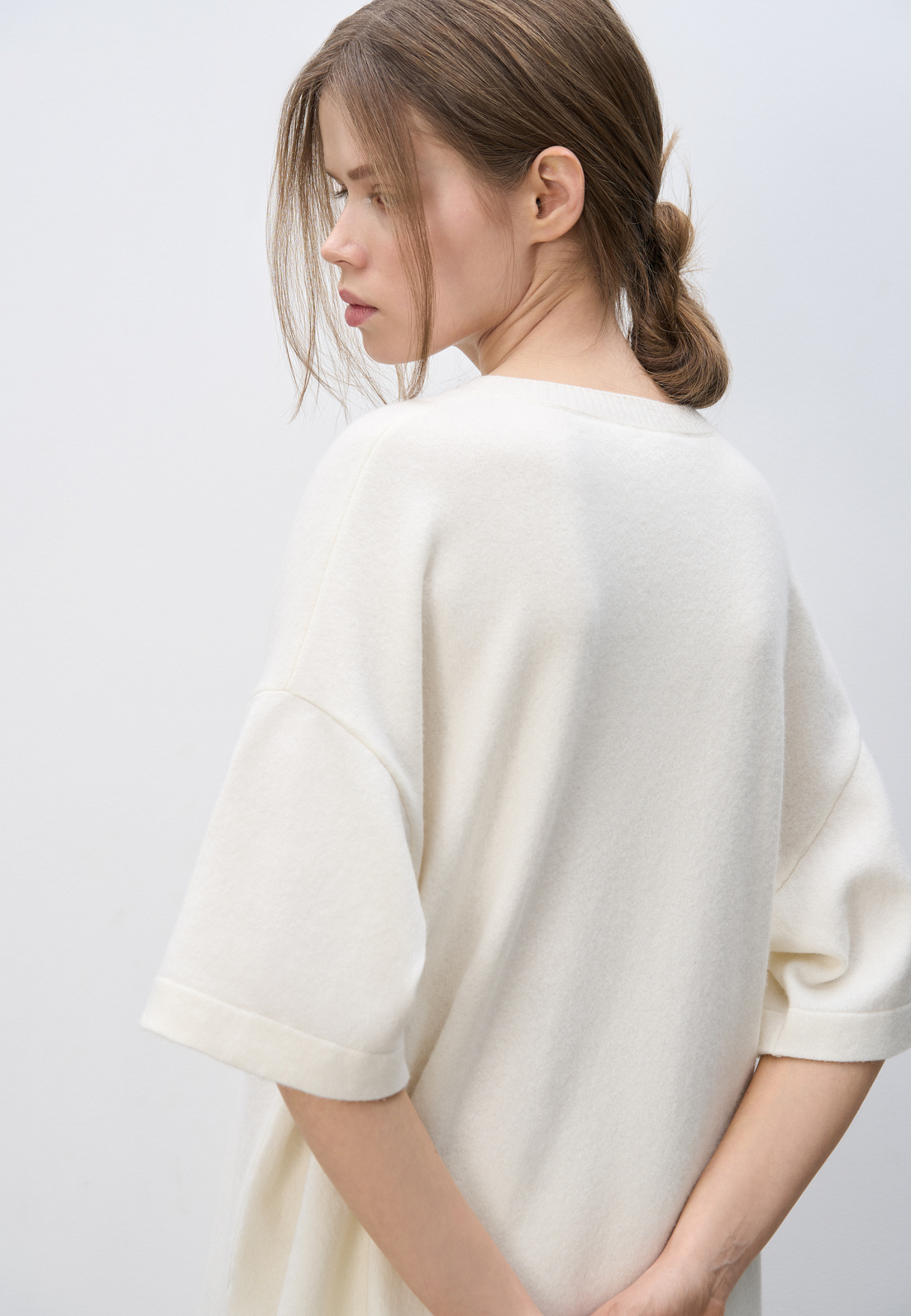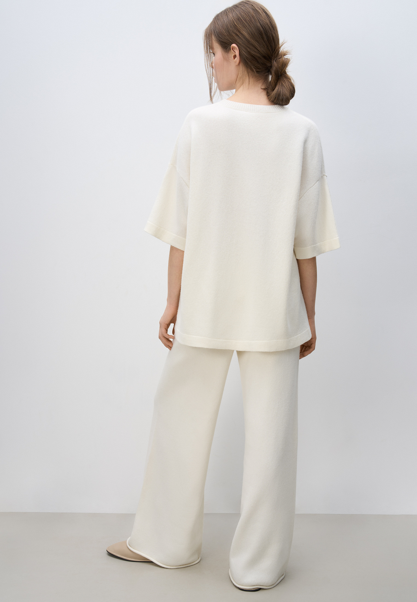 Трикотажная футболка из шерсти с добавлением кашемира. Модель свободного силуэта со спущенной линией плеча и круглой горловиной.