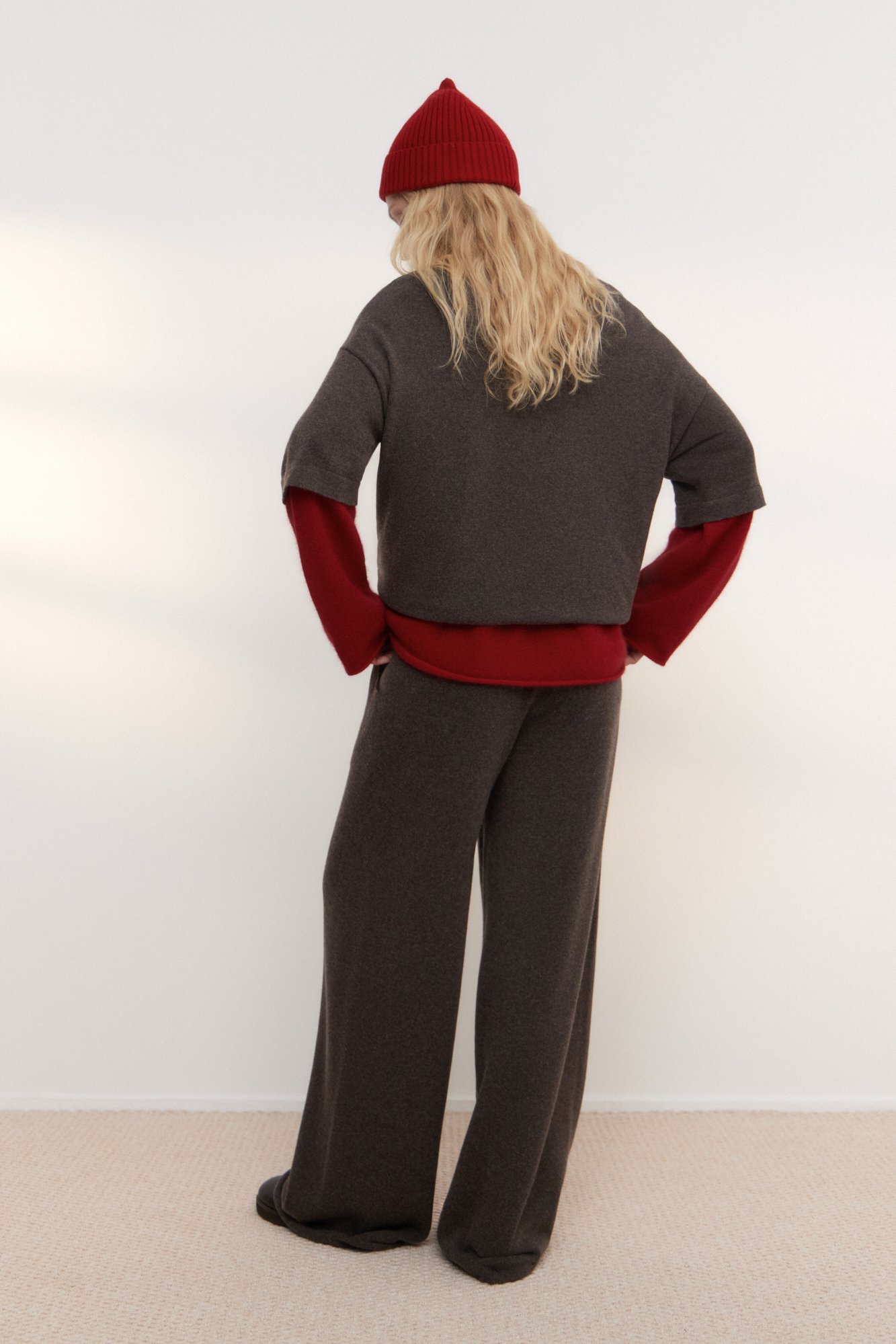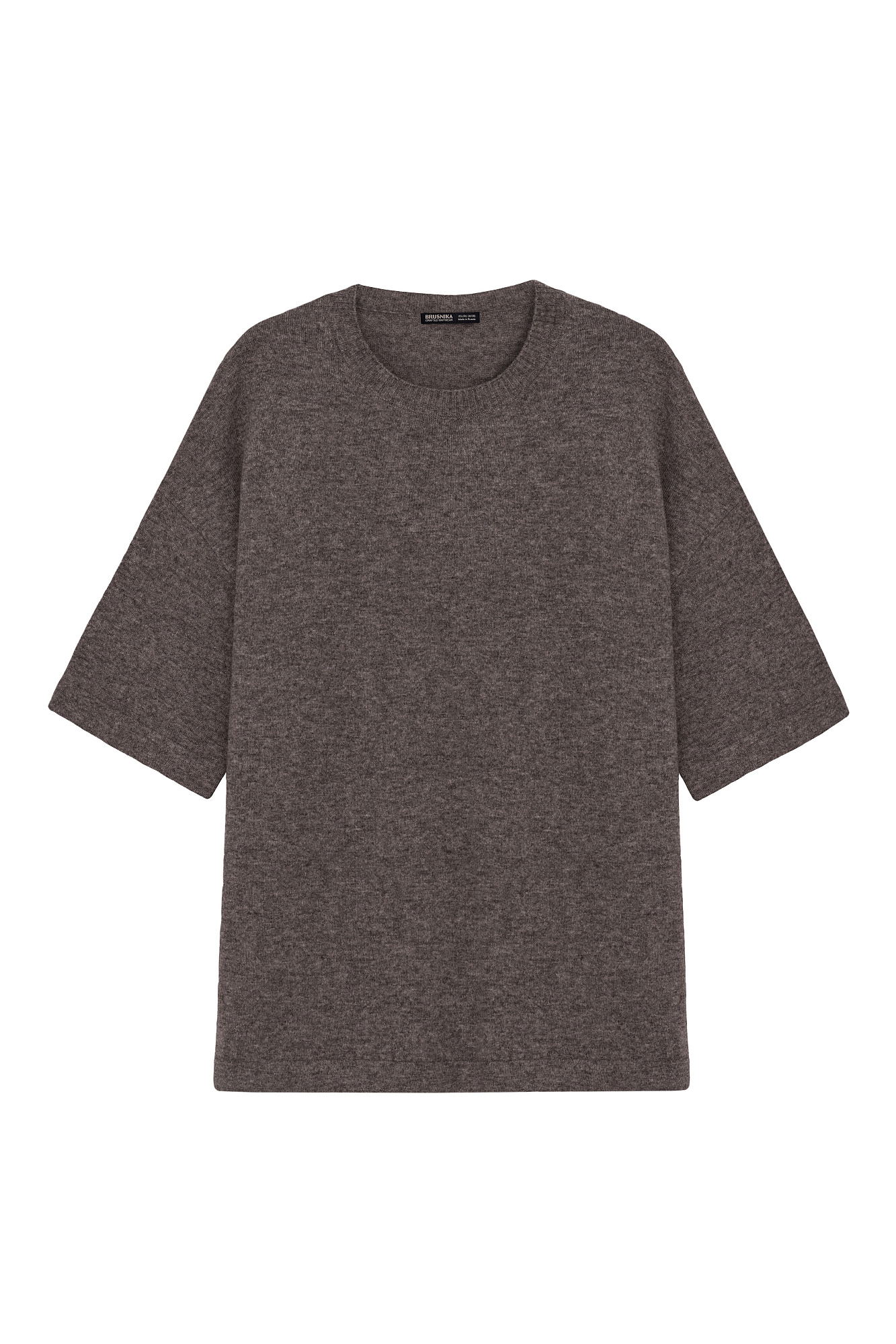 Трикотажная футболка из шерсти с добавлением кашемира. Модель свободного силуэта со спущенной линией плеча и круглой горловиной
