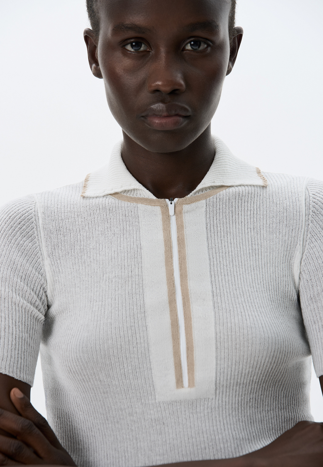 Трикотажная футболка-поло из 100% хлопка. Модель приталенного силуэта, с коротким рукавом, отложным воротником и застежкой на потайную молнию. Изделие декорировано бежевой отделкой на воротнике и вдоль планки.