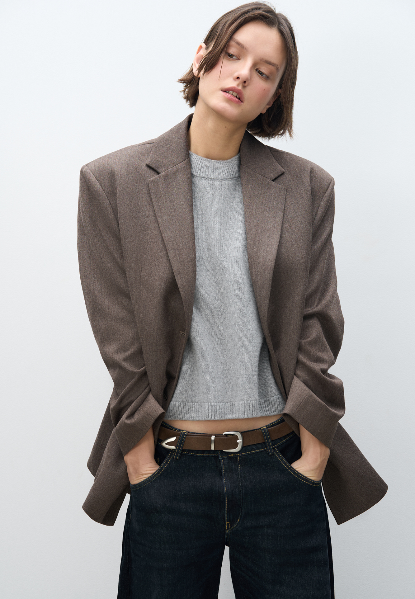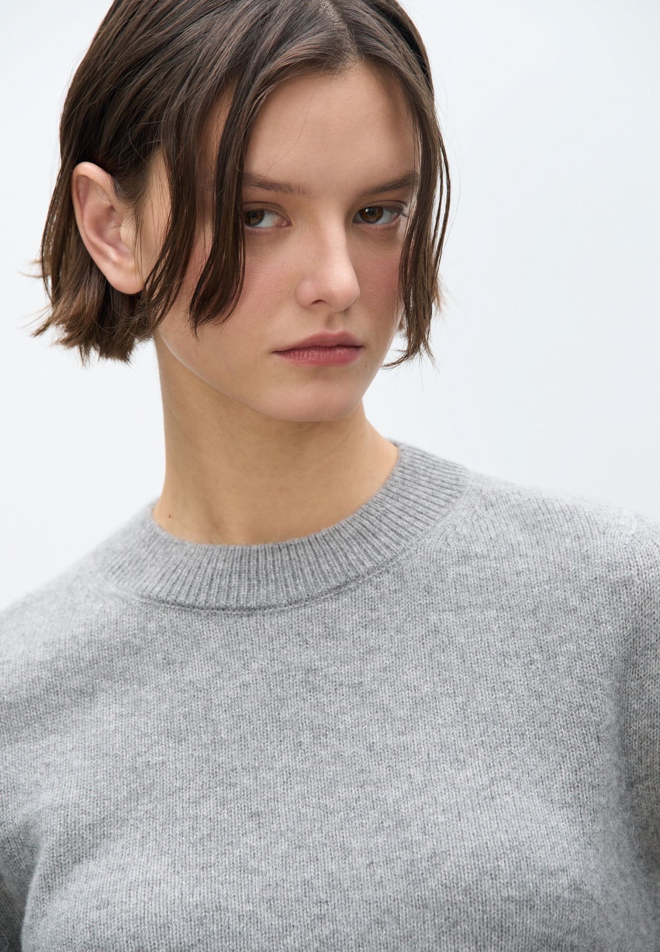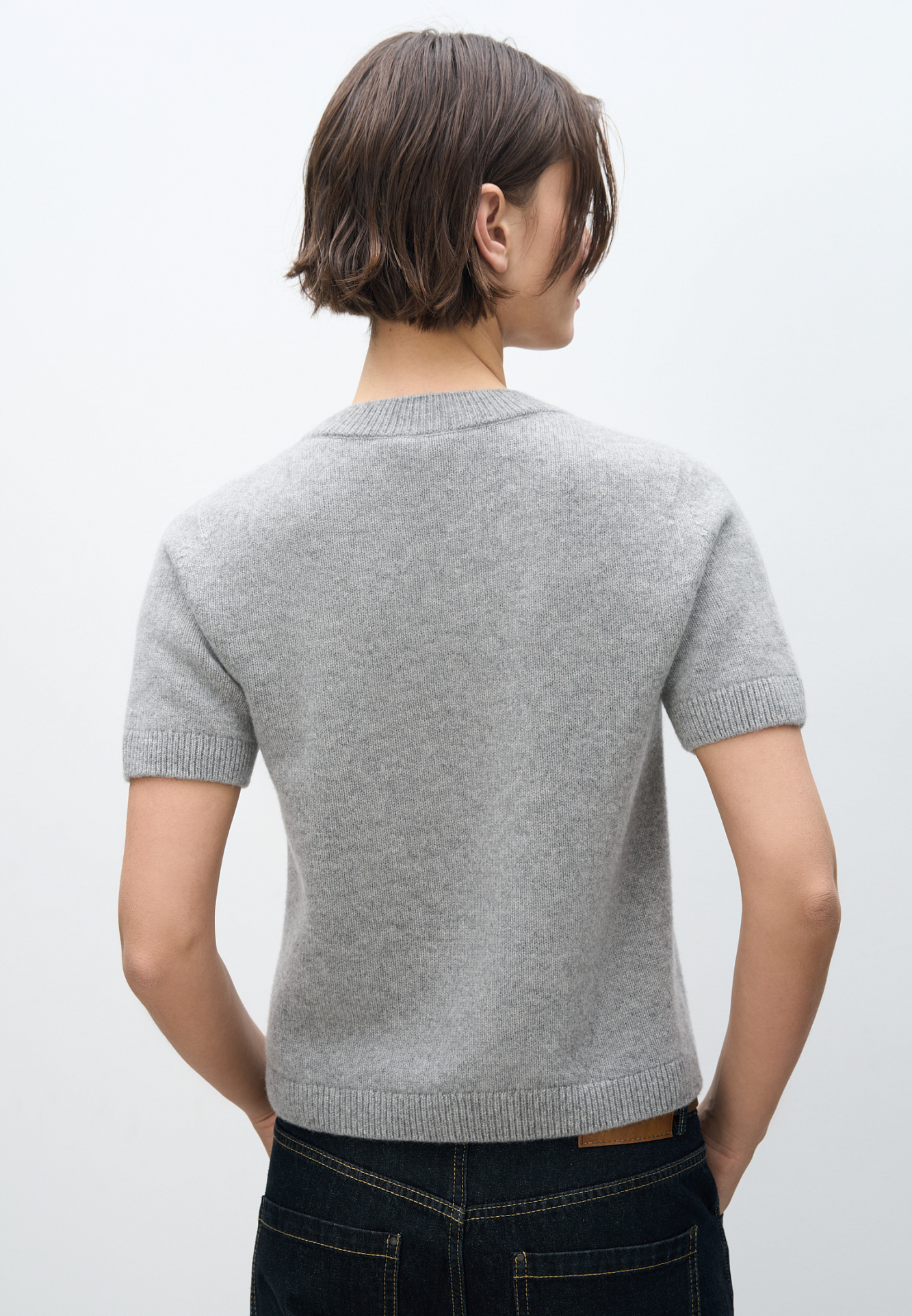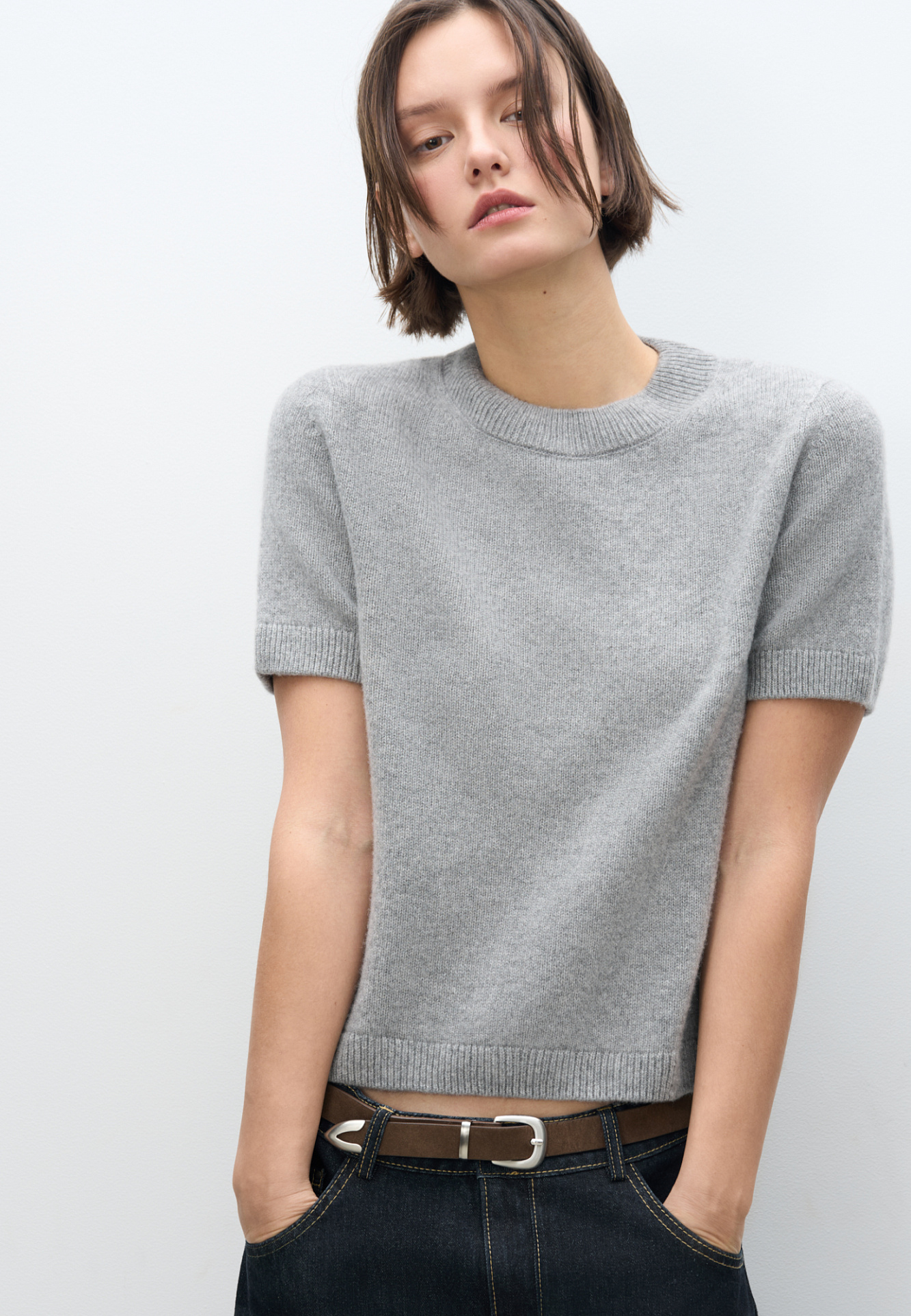 Трикотажная футболка из 100% кашемира. Модель свободного силуэта, с коротким рукавом и круглым вырезом горловины. Края изделия выполнены в рубчик.