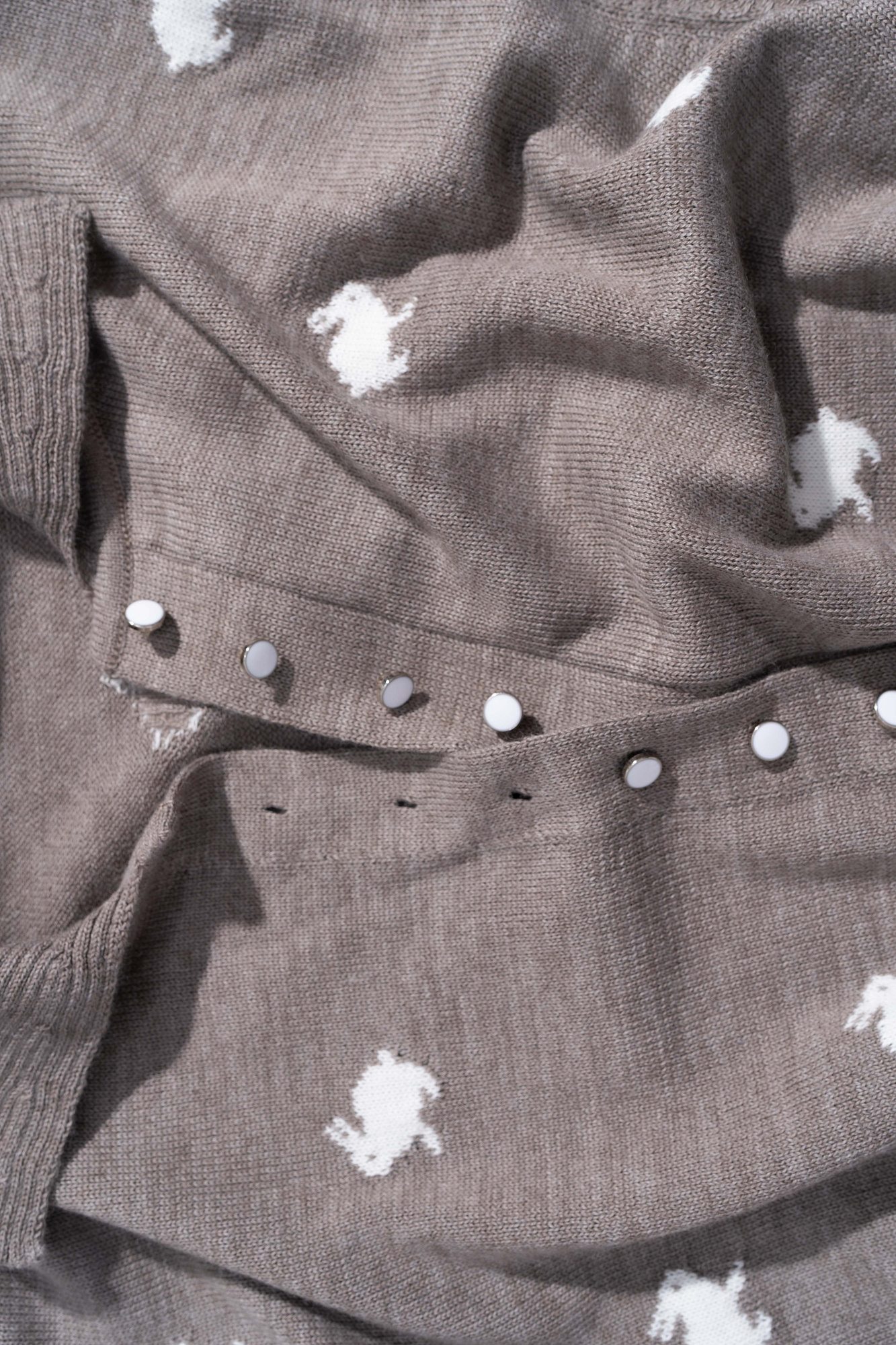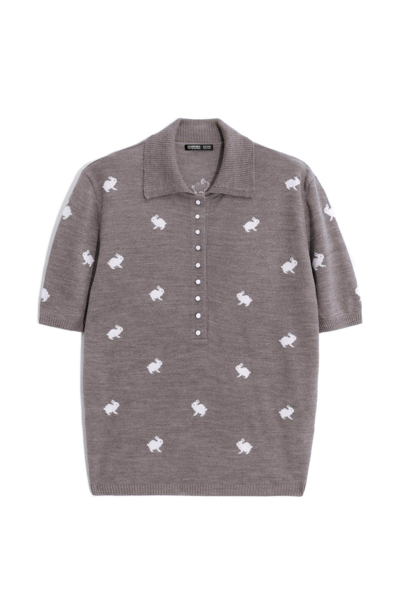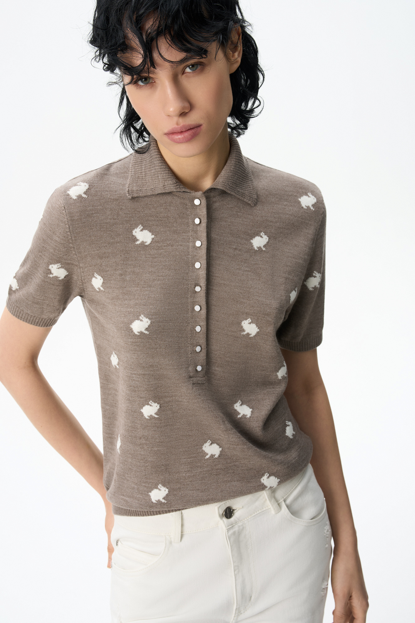 Трикотажная футболка из шерсти. Модель свободного кроя с воротником поло и застежкой на маленькие пуговицы на планке. Изделие декорировано жаккардом в виде зайчиков.