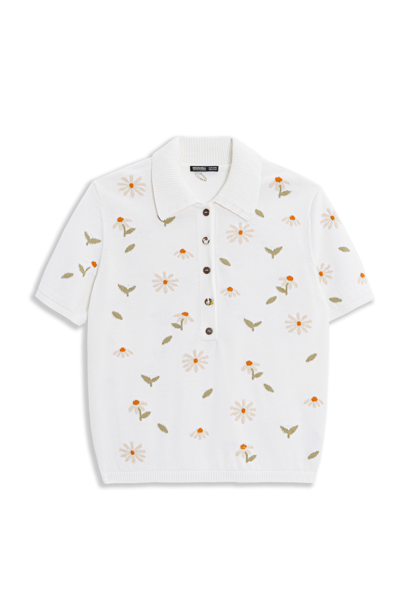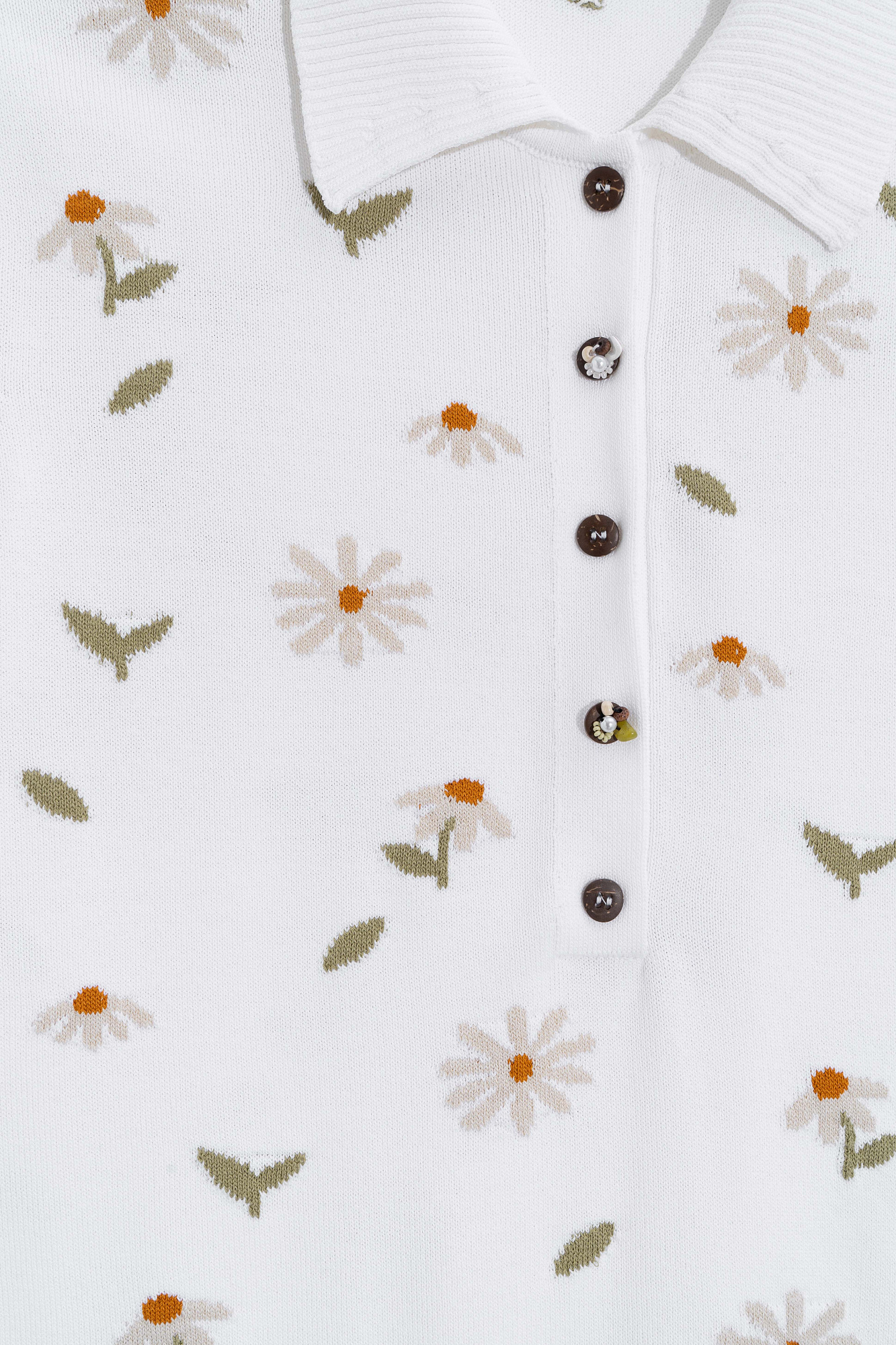 Трикотажная футболка из вискозы с цветочным жаккаржовым узором. Модель с воротником поло, планкой на пуговицах, декорированных бисером и коротким рукавом.