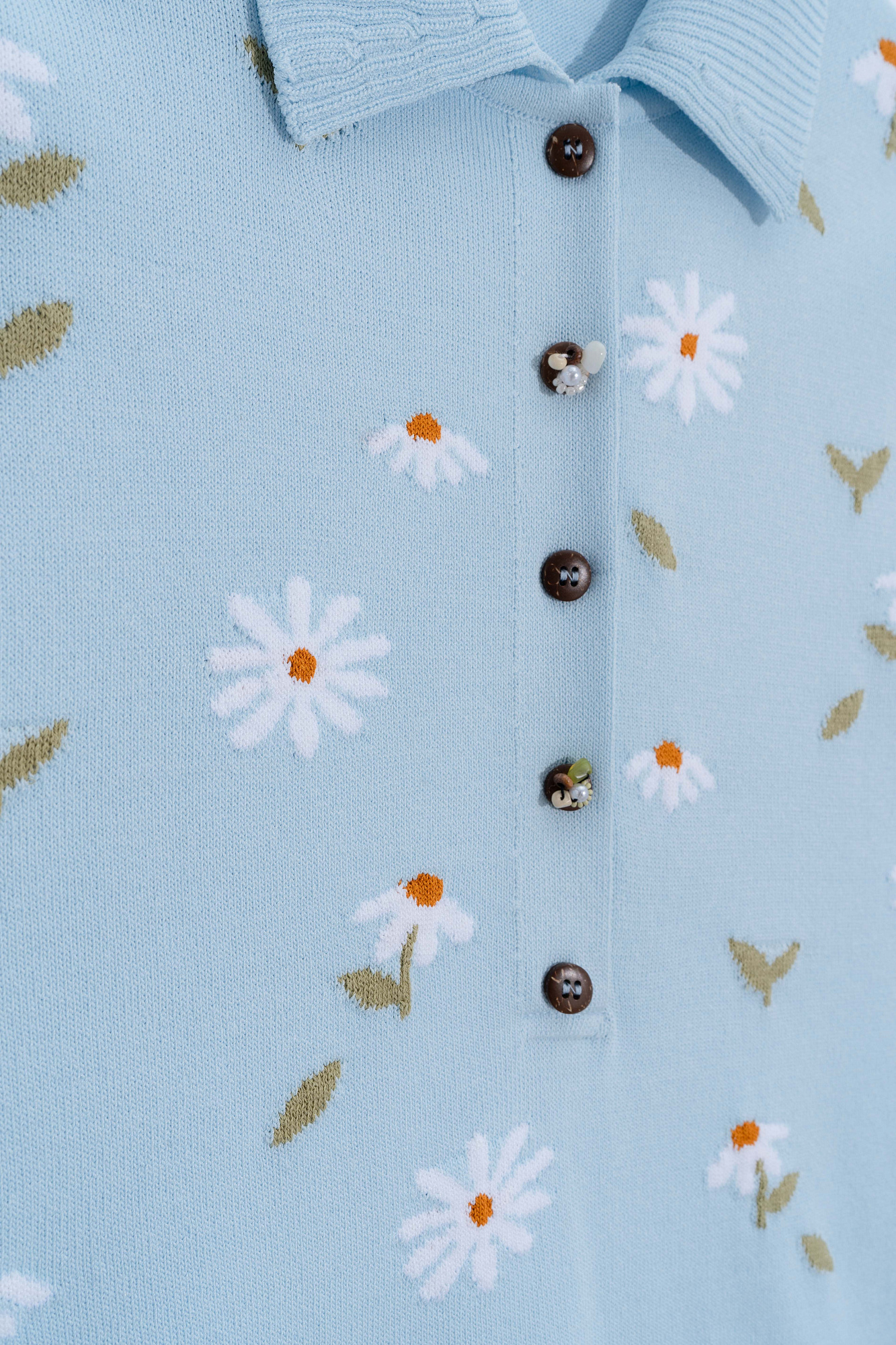 Трикотажная футболка из вискозы с цветочным жаккаржовым узором. Модель с воротником поло, планкой на пуговицах, декорированных бисером и коротким рукавом.
