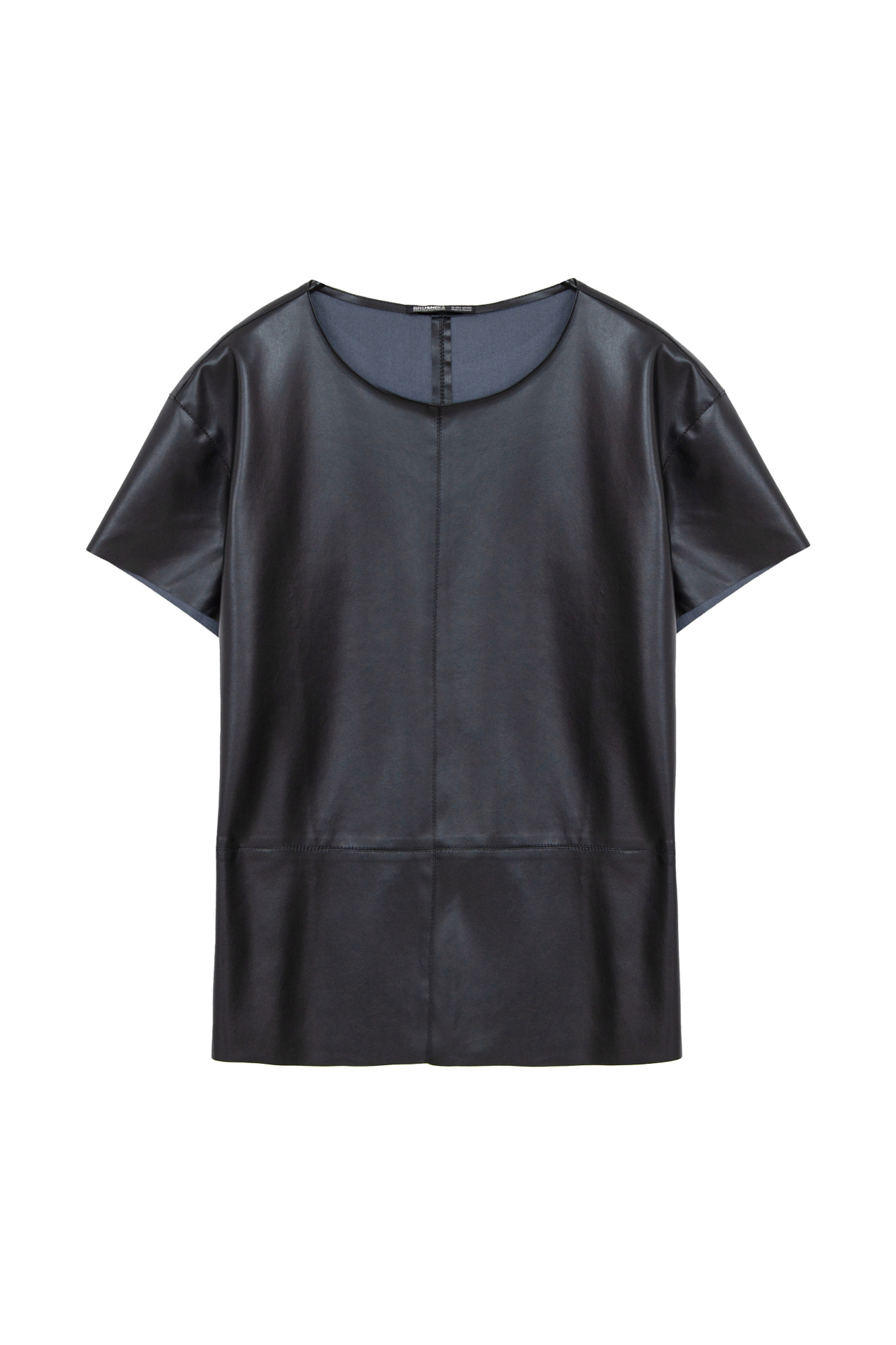 Футболка из экокожи. Модель прямого кроя, с коротким рукавом и круглым вырезом горловины.