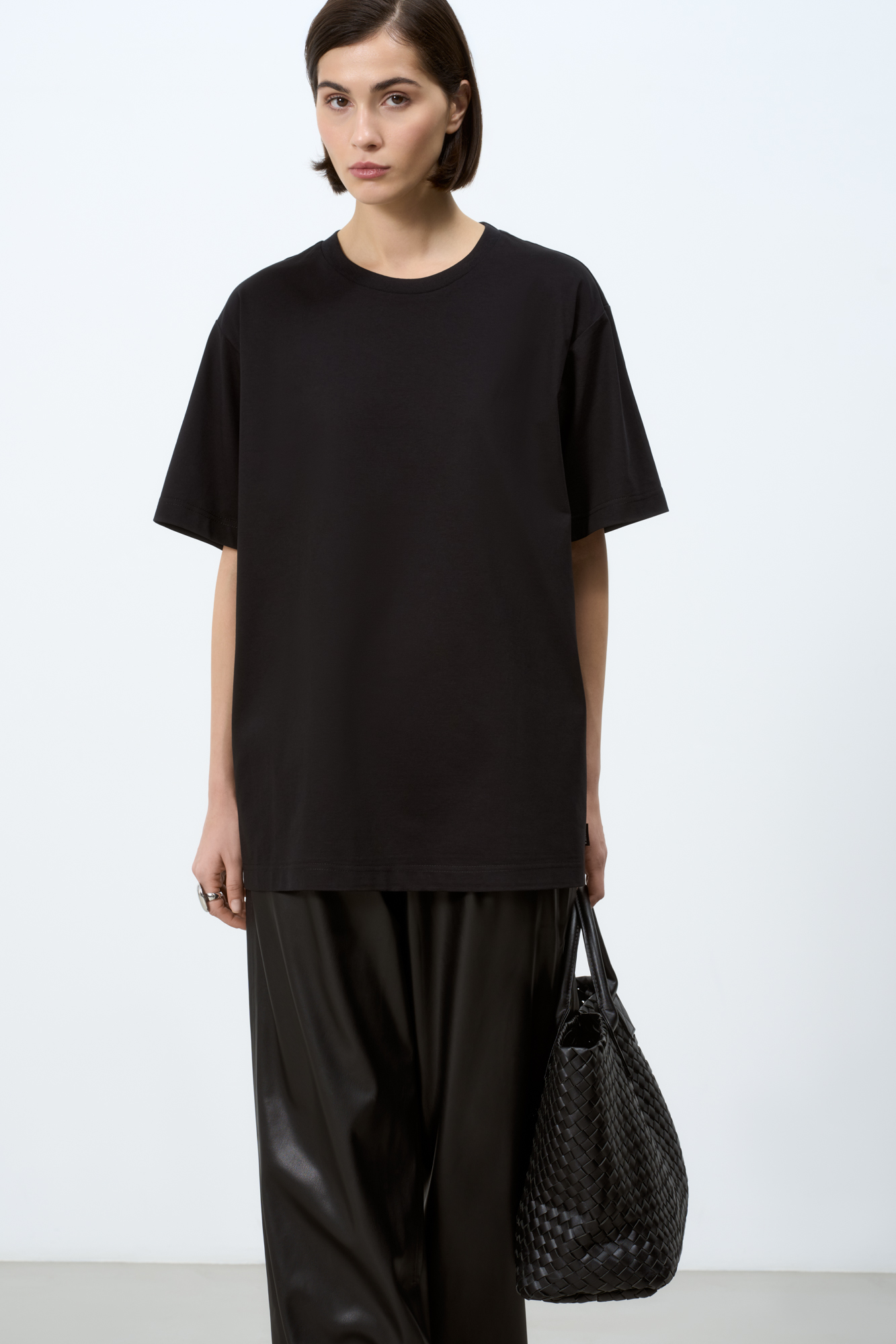 Удлиненная футболка из 100% хлопка со спущенным рукавом и брендированным ярлыком снизу.