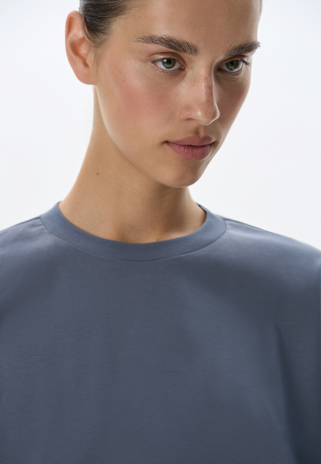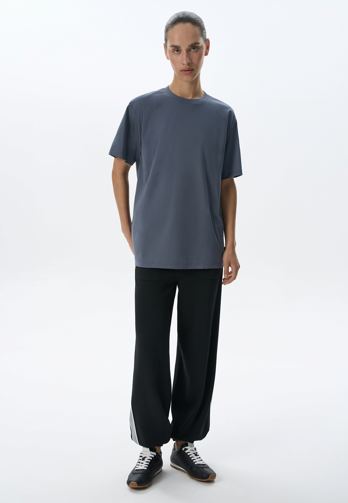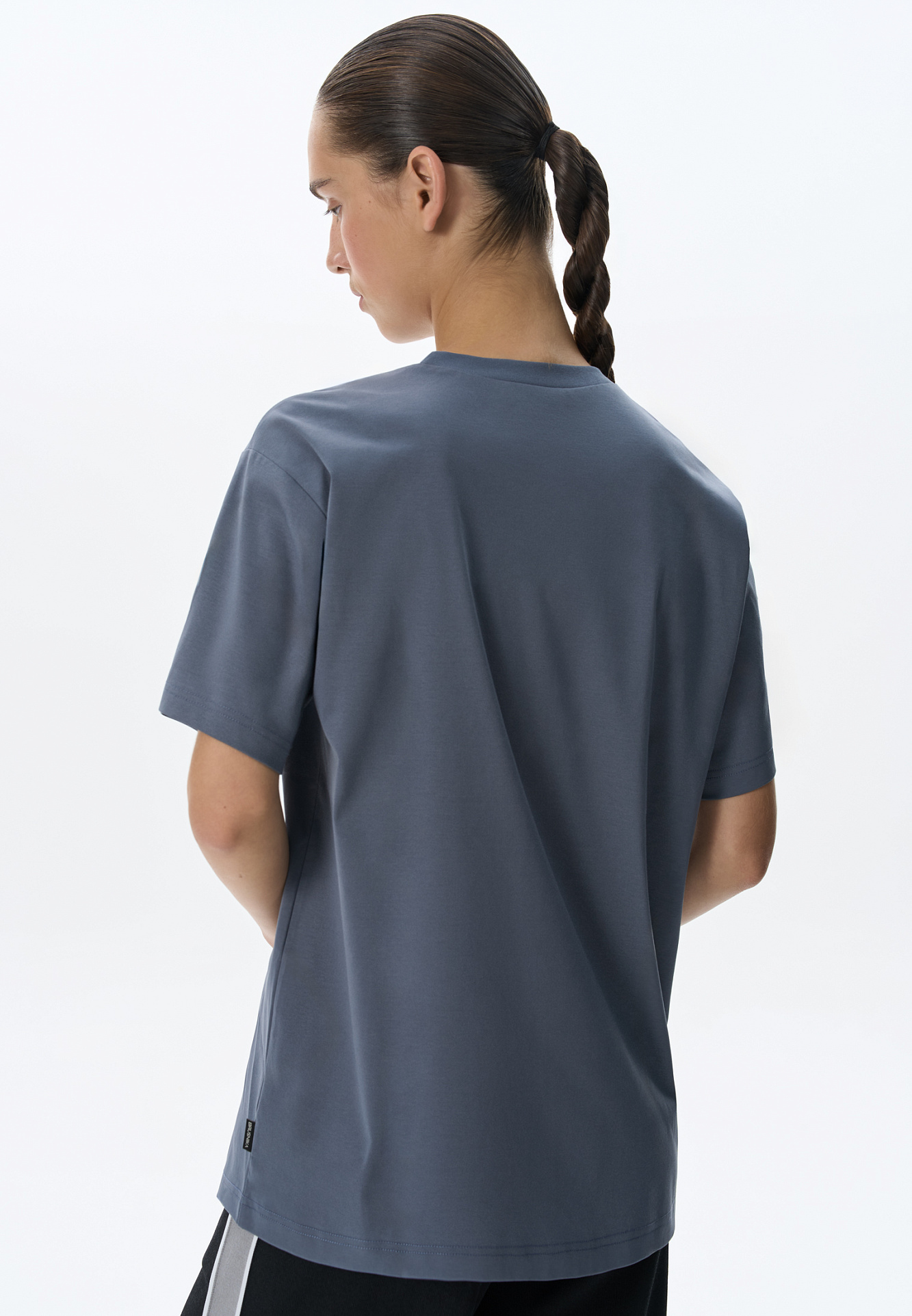 Футболка из 100% хлопка. Модель свободного силуэта, с круглым вырезом горловины и спущенной линией плеча.