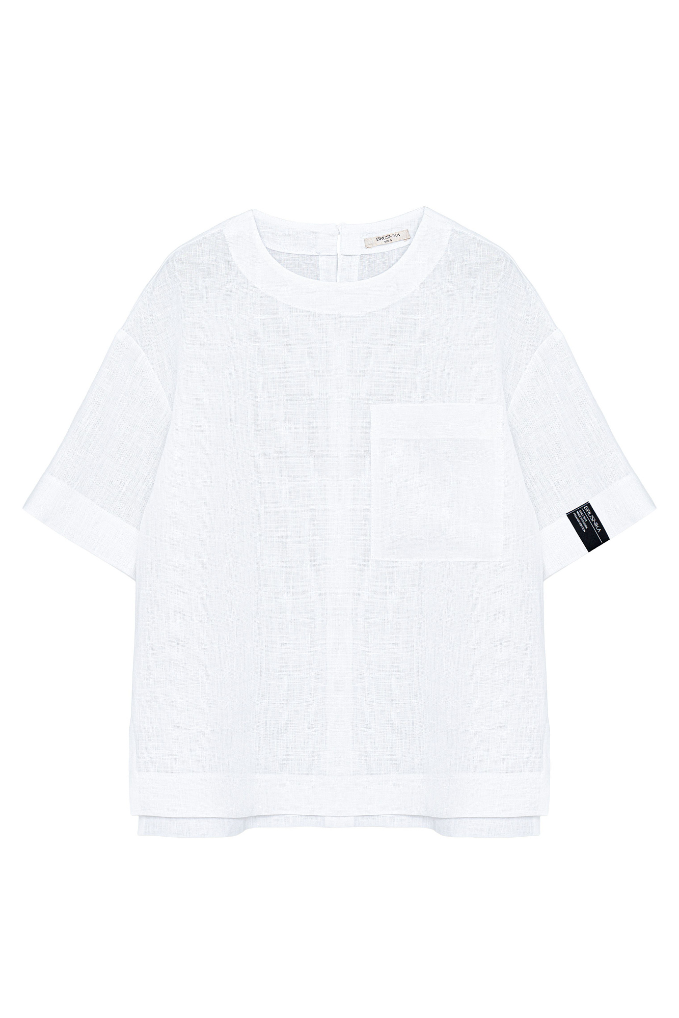 Широкая футболка из 100% льна. Модель прямого кроя, со спущенной линией плеча, круглым вырезом горловины и асимметричным низом с разрезами по бокам. Изделие декорировано накладным карманом на груди и брендированным ярлыком на рукаве. Застежка на пуговицу сзади.