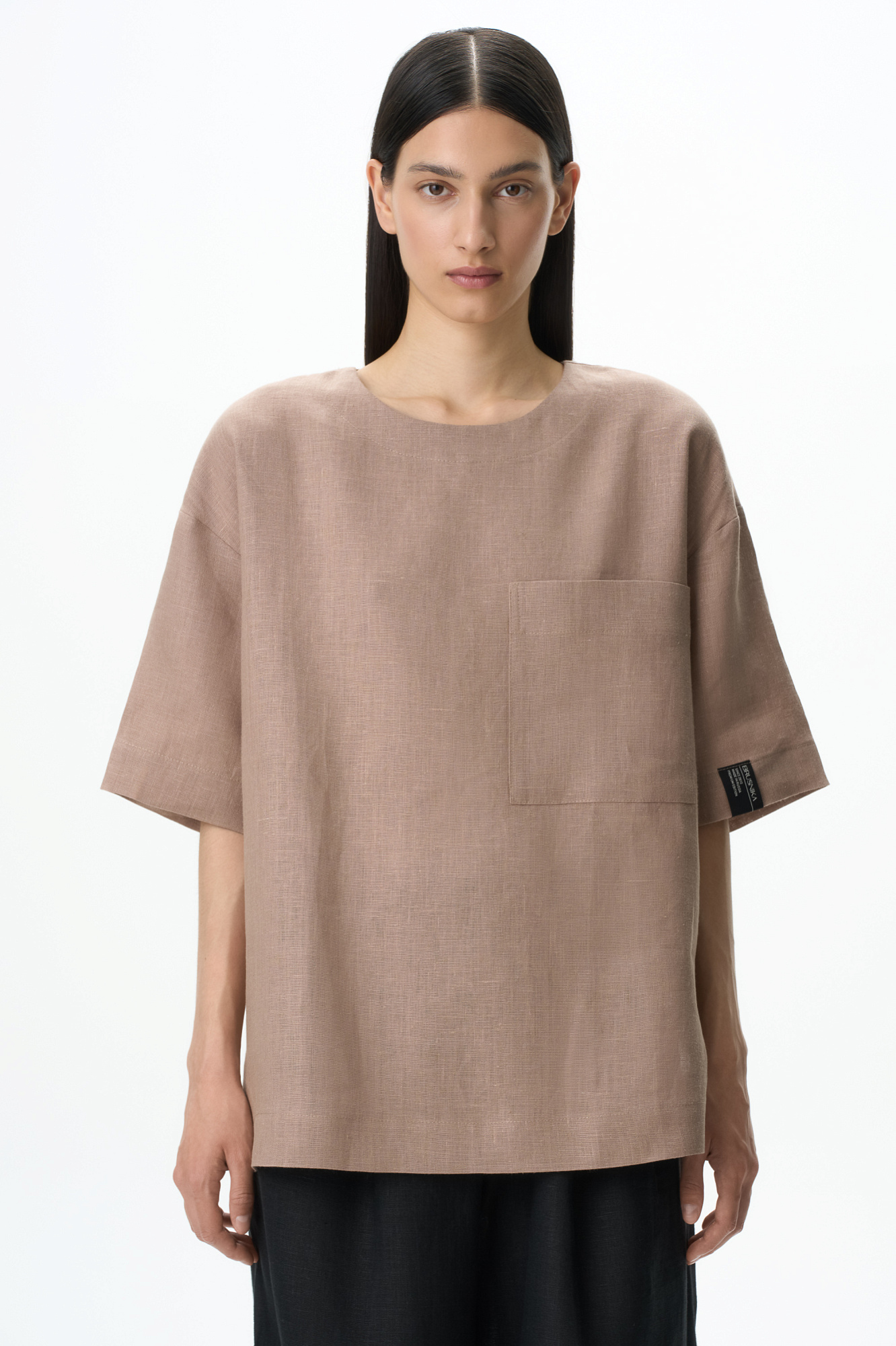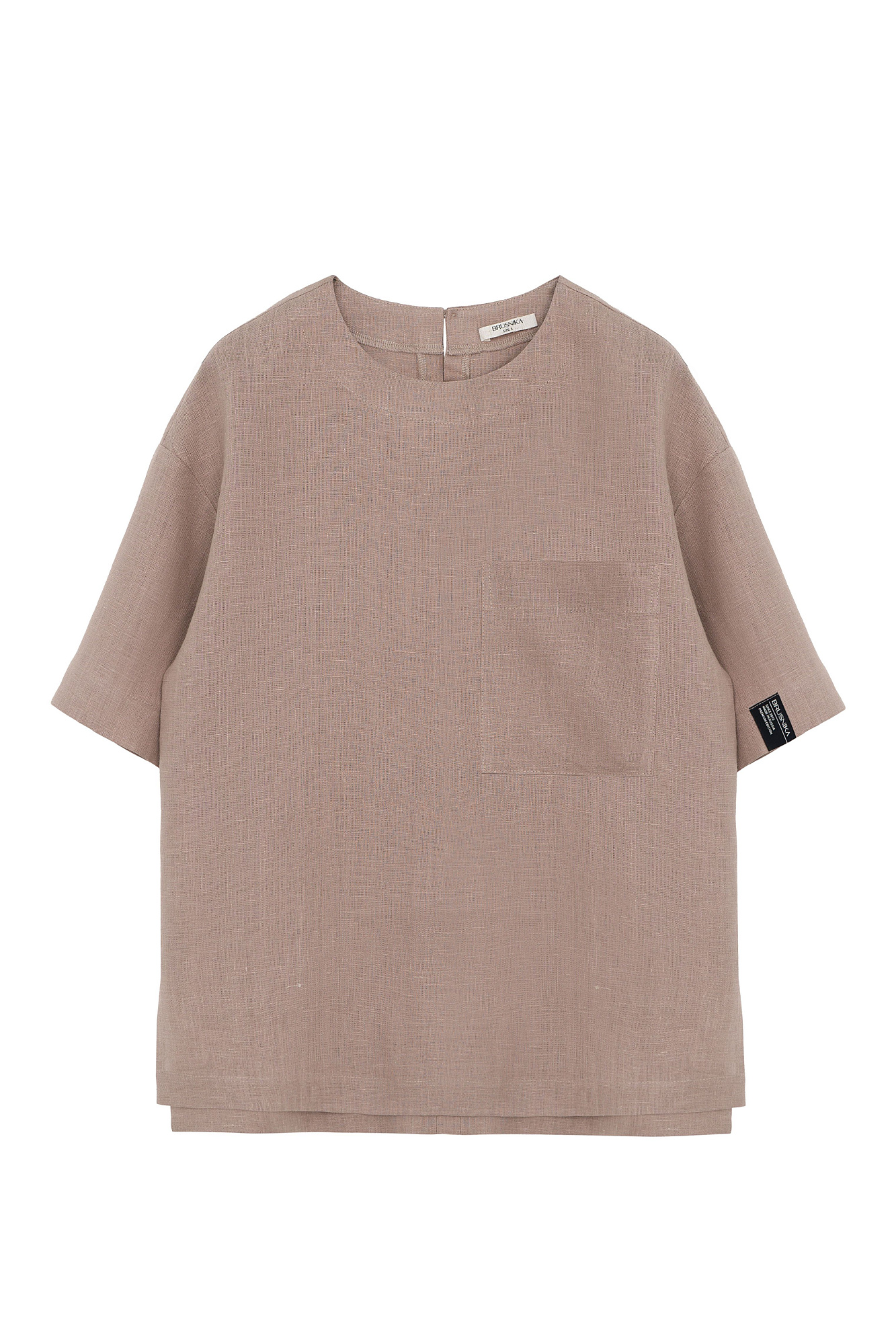 Широкая футболка из 100% льна. Модель прямого кроя, со спущенной линией плеча, круглым вырезом горловины и асимметричным низом с разрезами по бокам. Изделие декорировано накладным карманом на груди и брендированным ярлыком на рукаве. Застежка на пуговицу сзади.