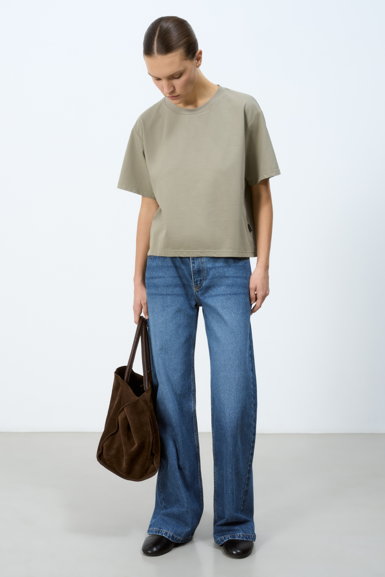 Укороченная футболка со спущенной линией плеча. Модель свободного силуэта с закругленным низом.
