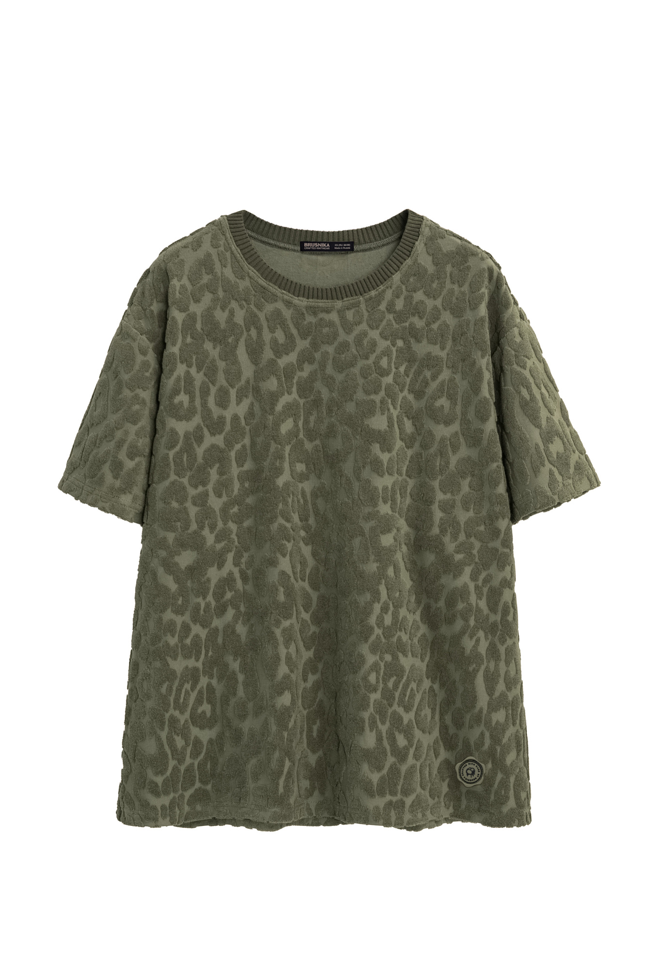 Длинная футболка из махрового трикотажа. Модель свободного силуэта со спущенной линией плеча. Дополнить образ можно шортами в таком же стиле.