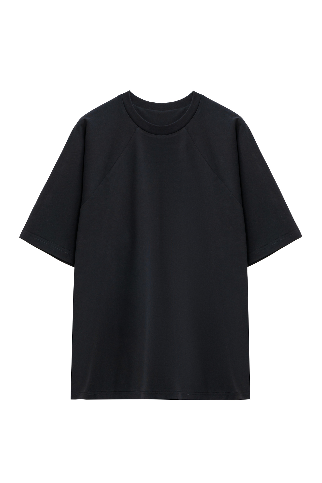 Футболка из хлопка с добавлением сорона. Модель прямого кроя, с круглым вырезом горловины и рукавом реглан.