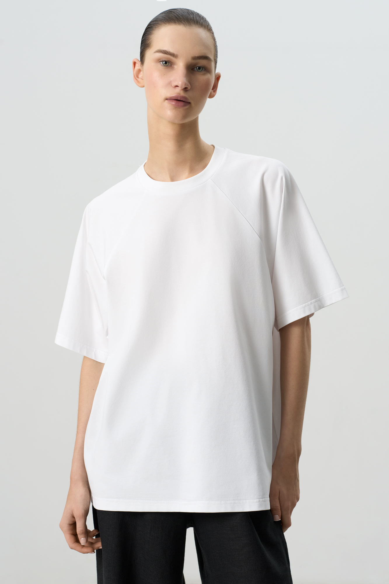 Футболка из хлопка с добавлением сорона. Модель прямого кроя, с круглым вырезом горловины и рукавом реглан.
