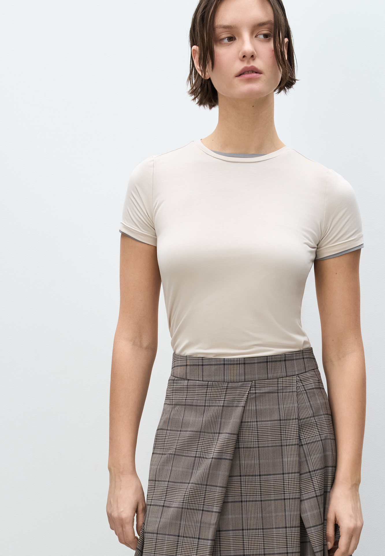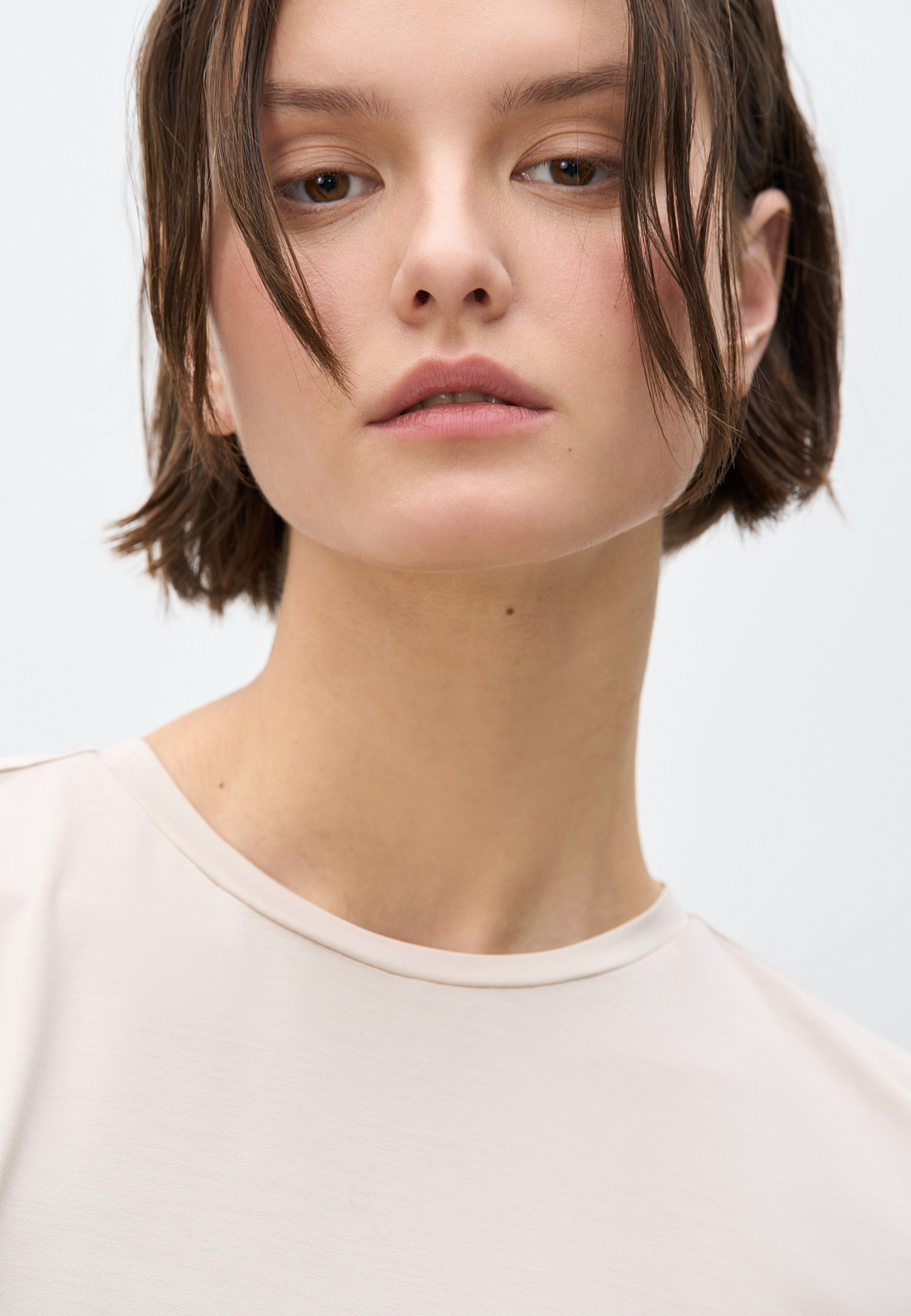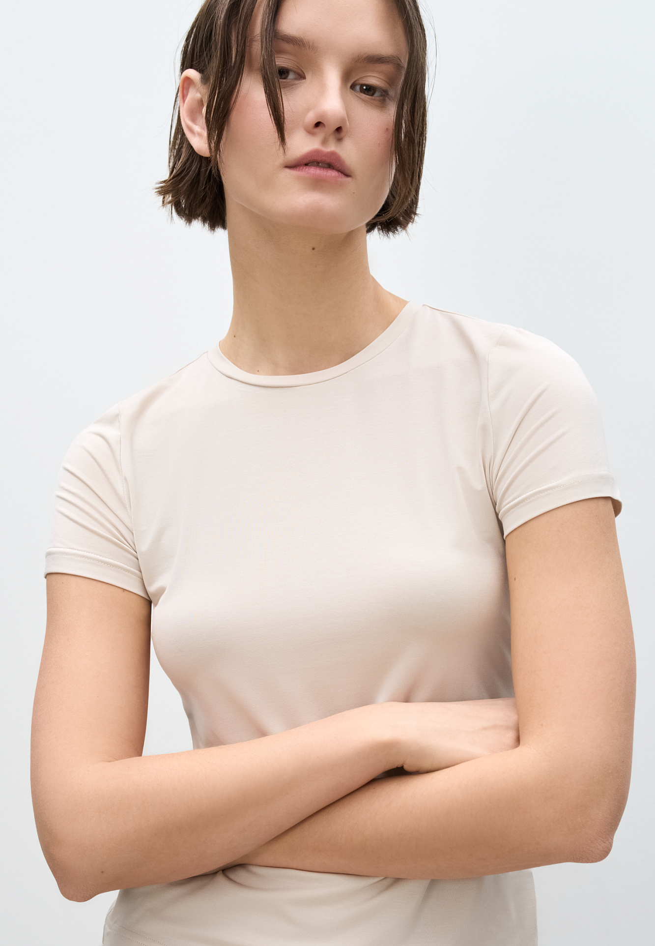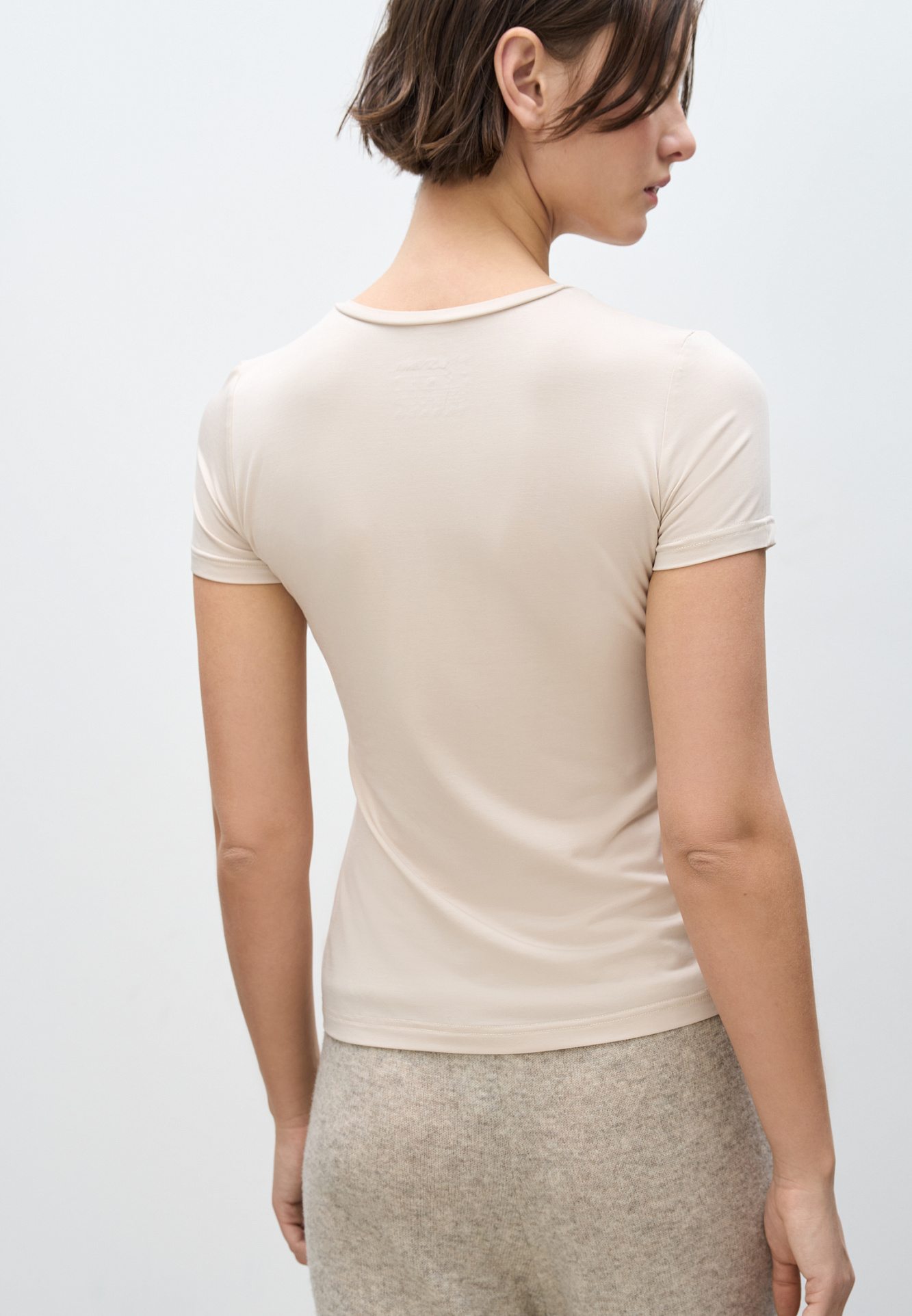 Футболка из модала облегающего силуэта. Модель с коротким рукавом и круглым вырезом горловины.