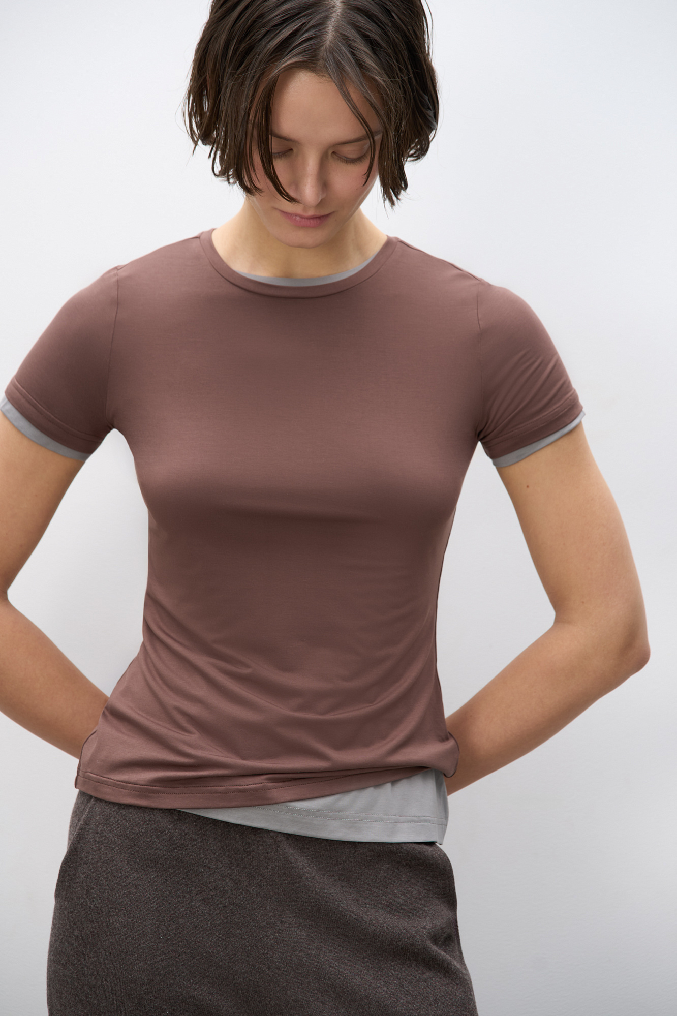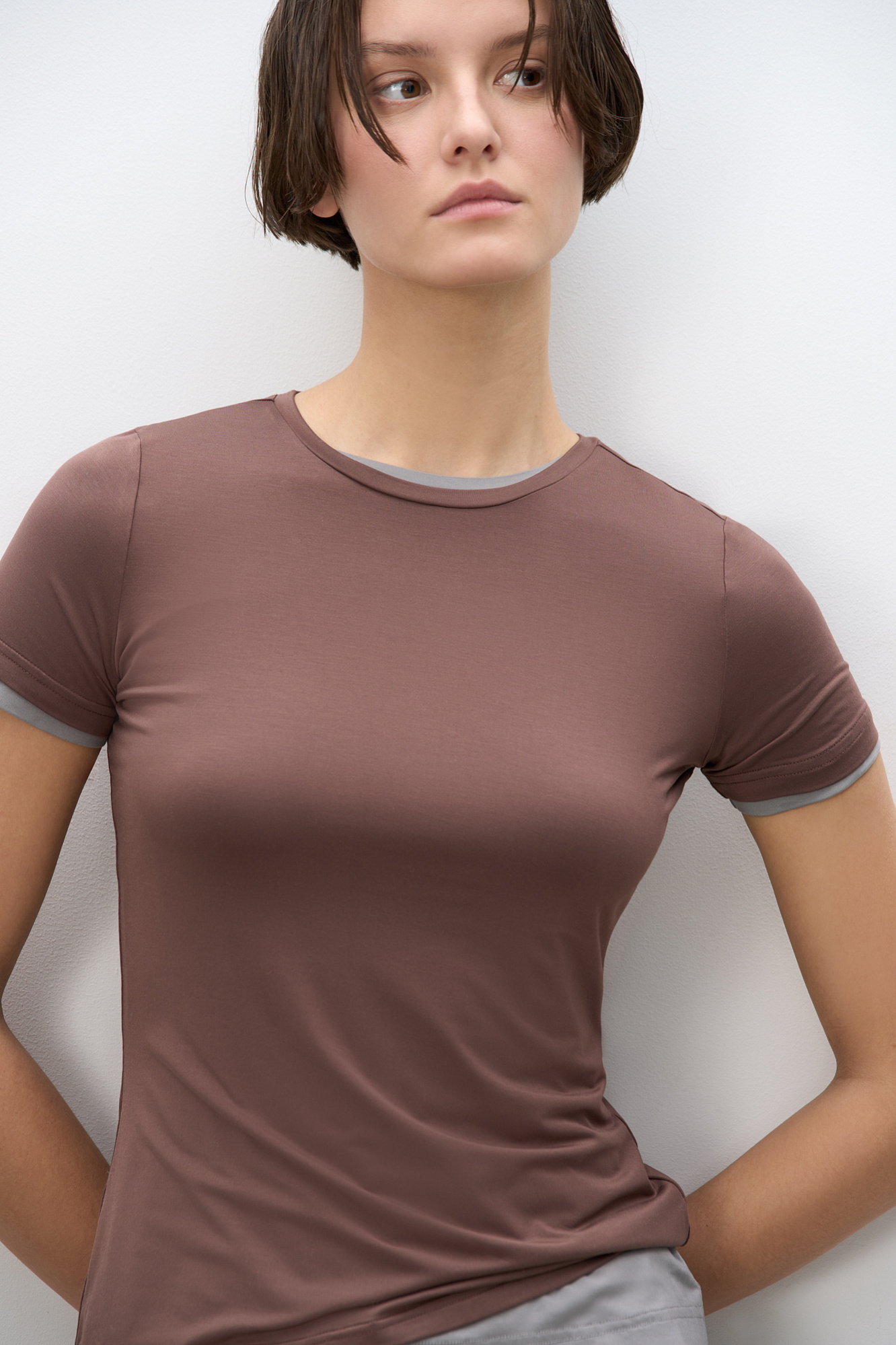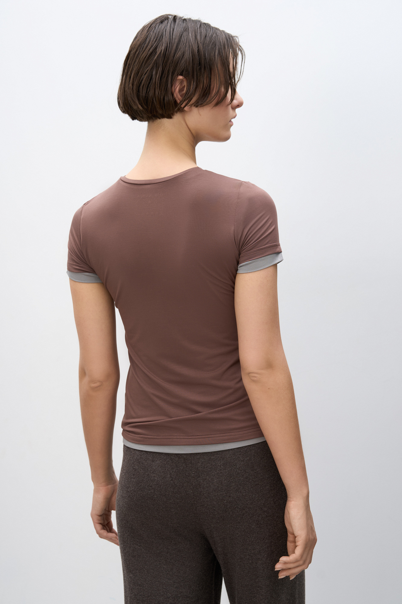 Футболка из модала облегающего силуэта. Модель с коротким рукавом и круглым вырезом горловины.