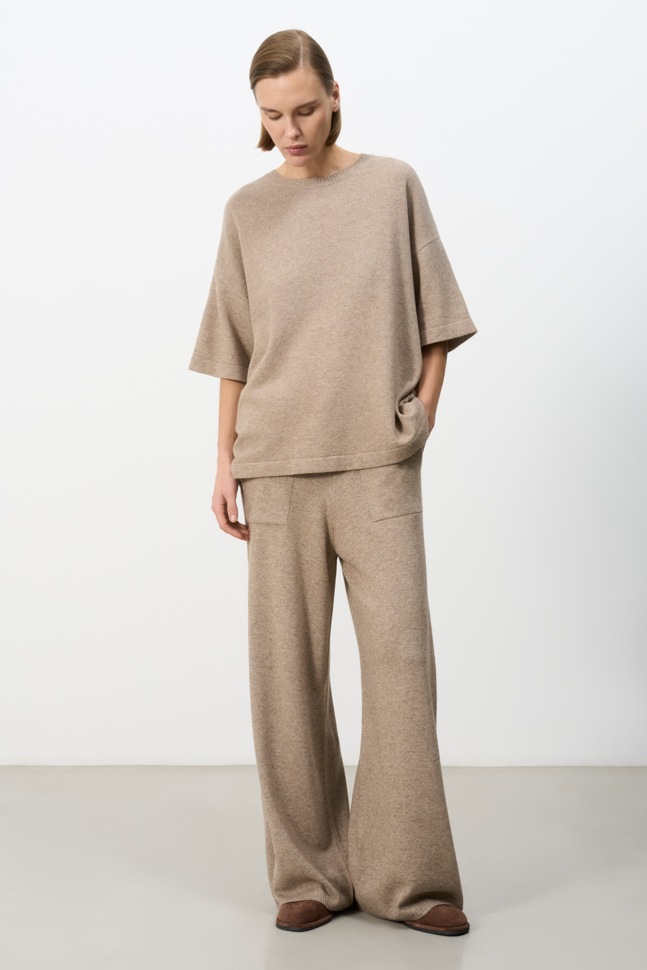 Трикотажная футболка из шерсти с добавлением кашемира. Модель свободного силуэта со спущенной линией плеча и круглой горловиной.