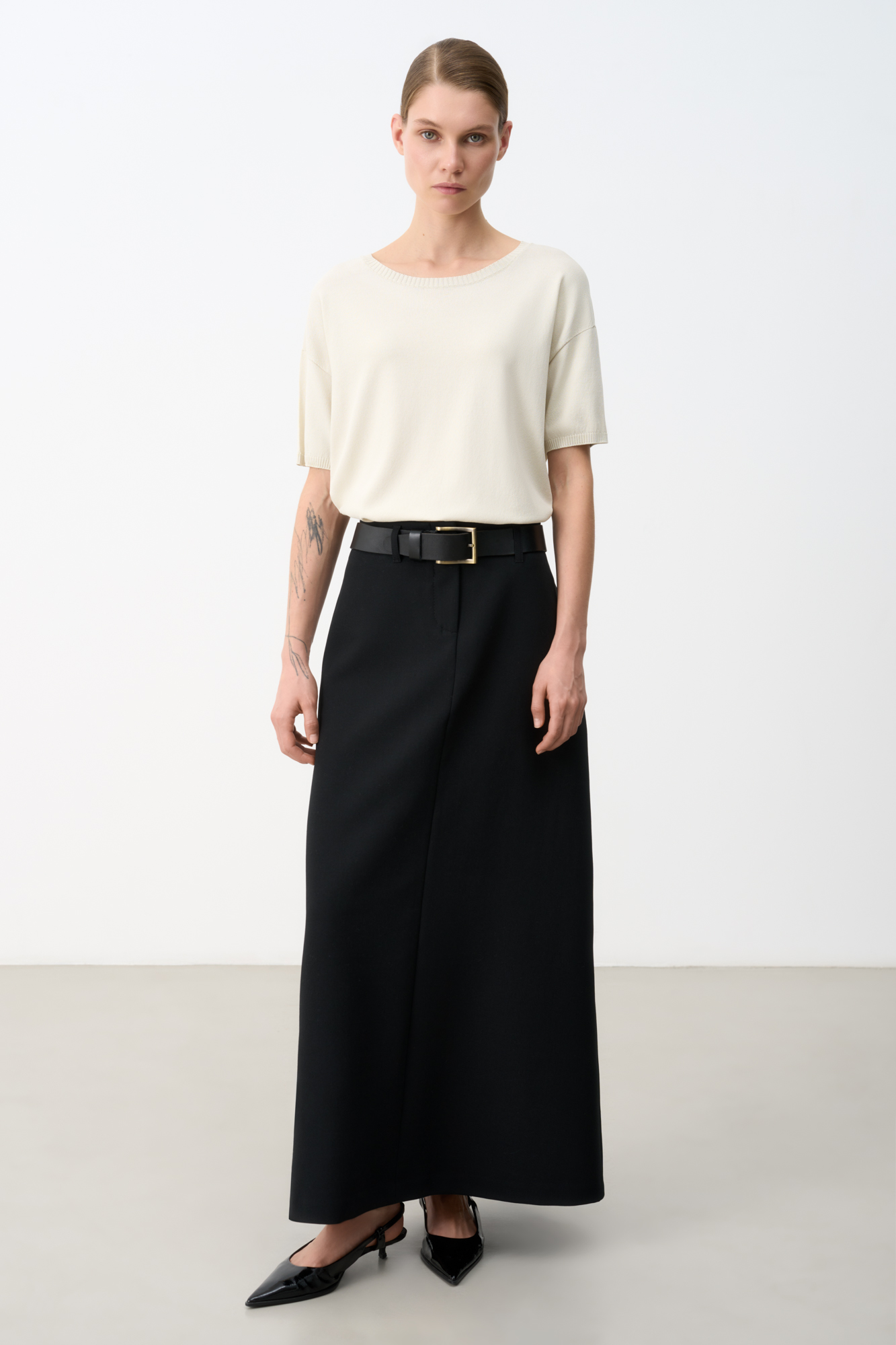 Трикотажная футболка из поливискозы. Модель свободного силуэта со спущенной линией плеча и круглым вырезом горловины. Манжеты рукавов, горловина и низ изделия выполнены в рубчик.