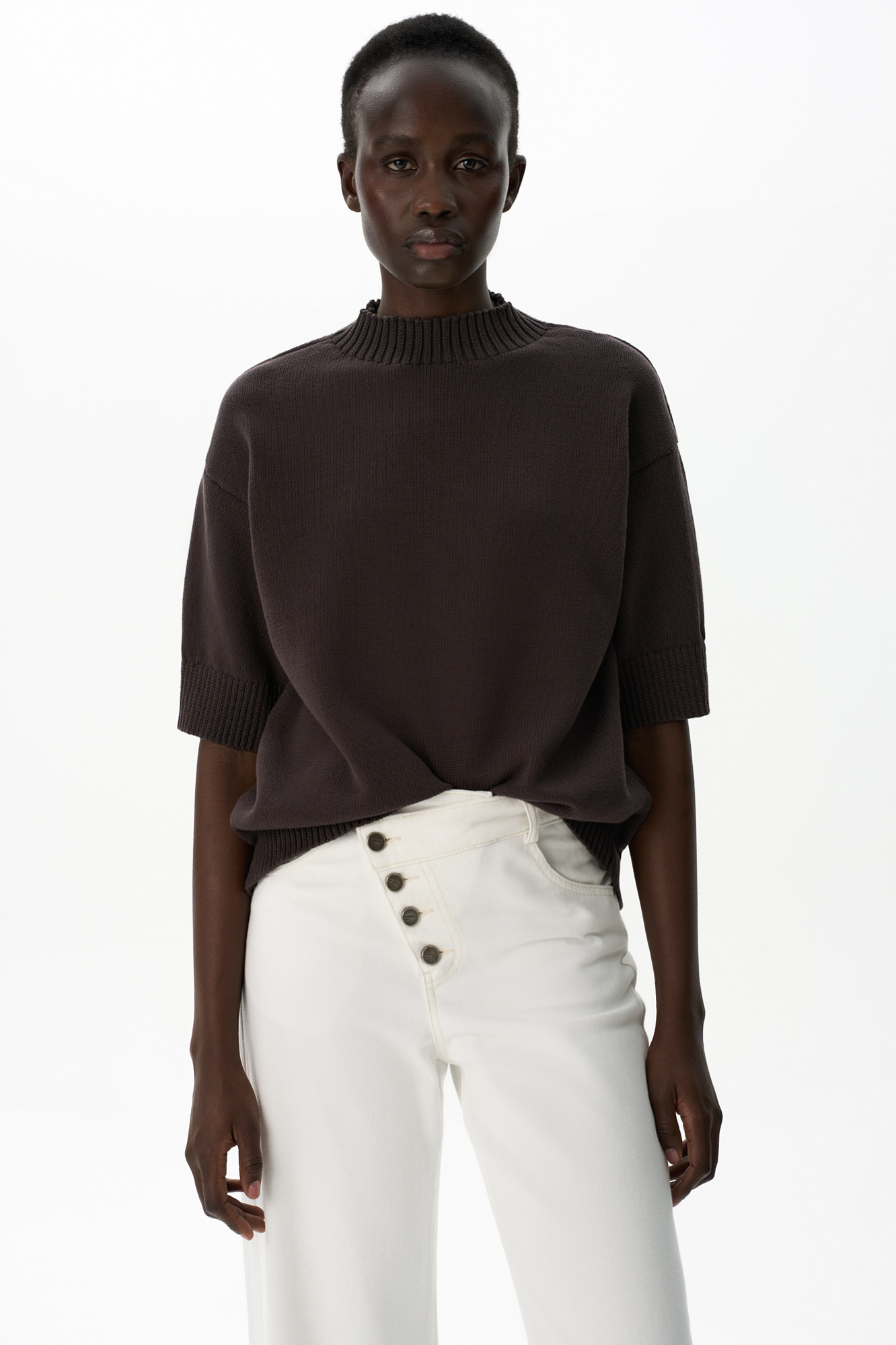 Трикотажная футболка из хлопка. Модель свободного силуэта со спущенной линией плеча, коротким рукавом и круглым вырезом горловины. Воротник, манжеты рукавов и низ изделия выполнены в широкий рубчик.