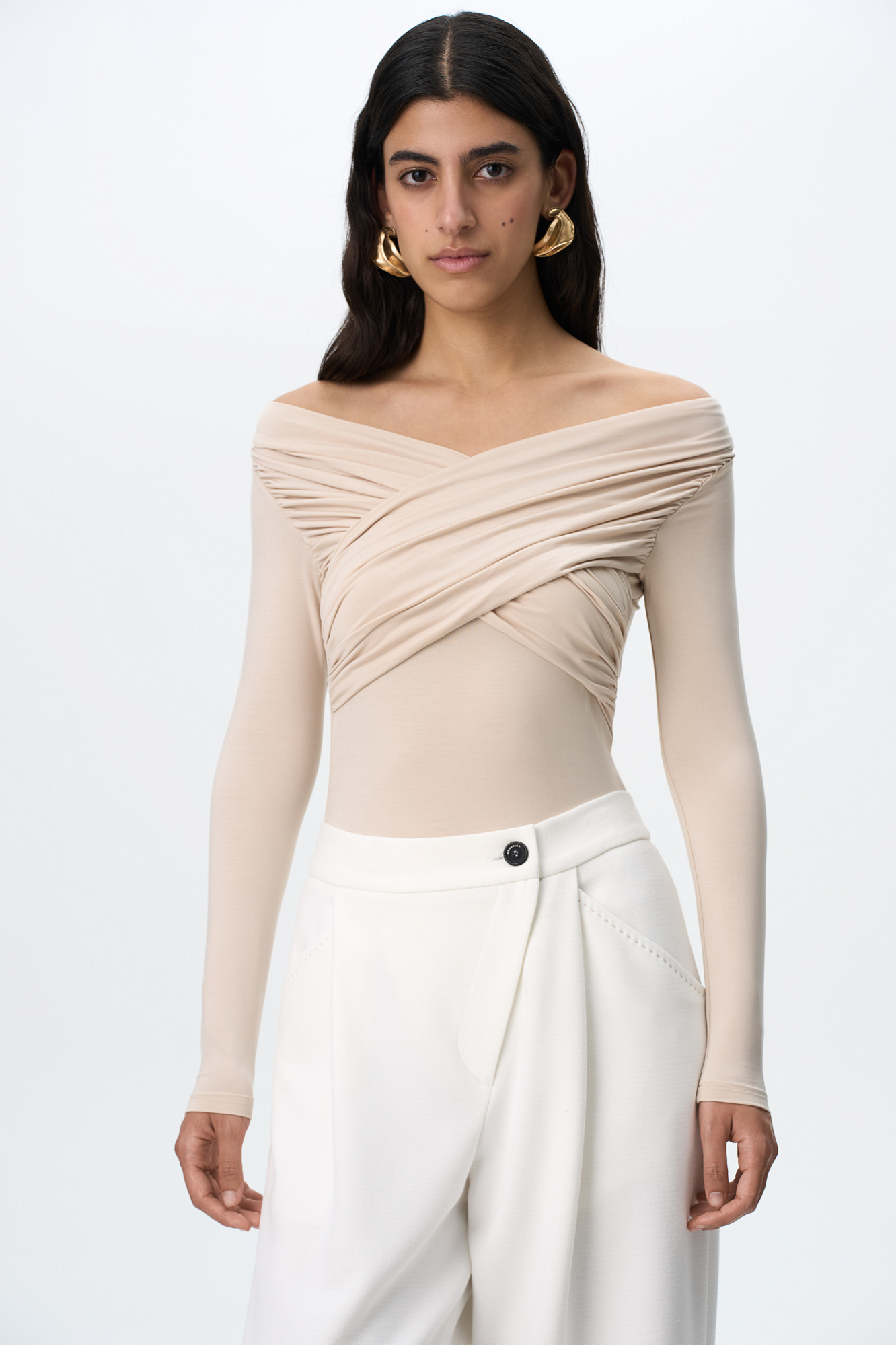Лонгслив из модала. Модель приталенного силуэта с длинными рукавами. Изделие декорировано перекрутом на груди.