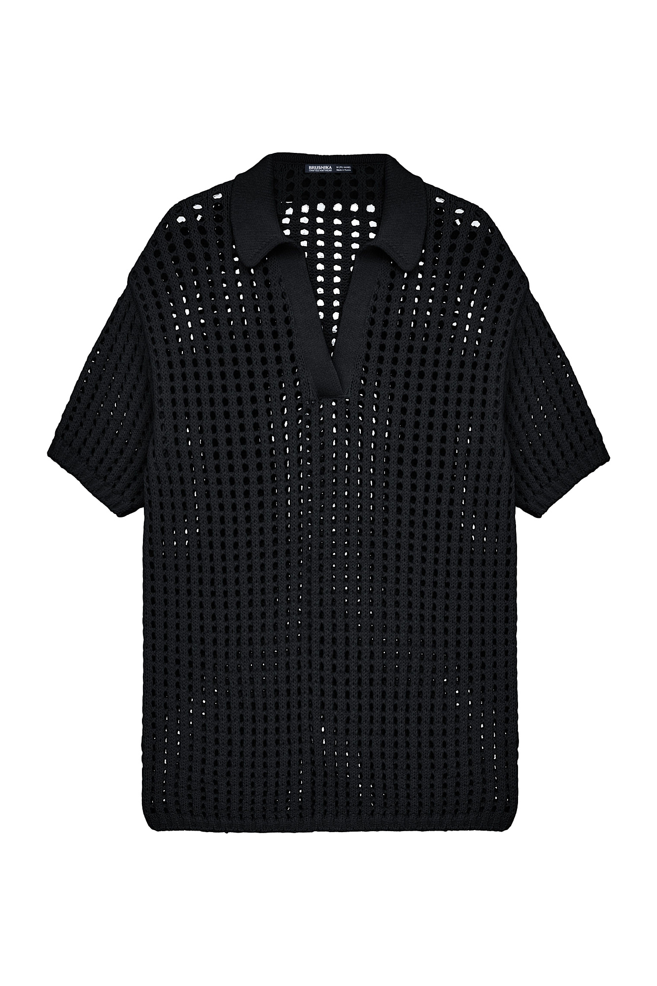 Трикотажная ажурная футболка из 100% хлопка. Модель со спущенным рукавом и воротником-поло. Дополнить образ можно шортами в таком же стиле.