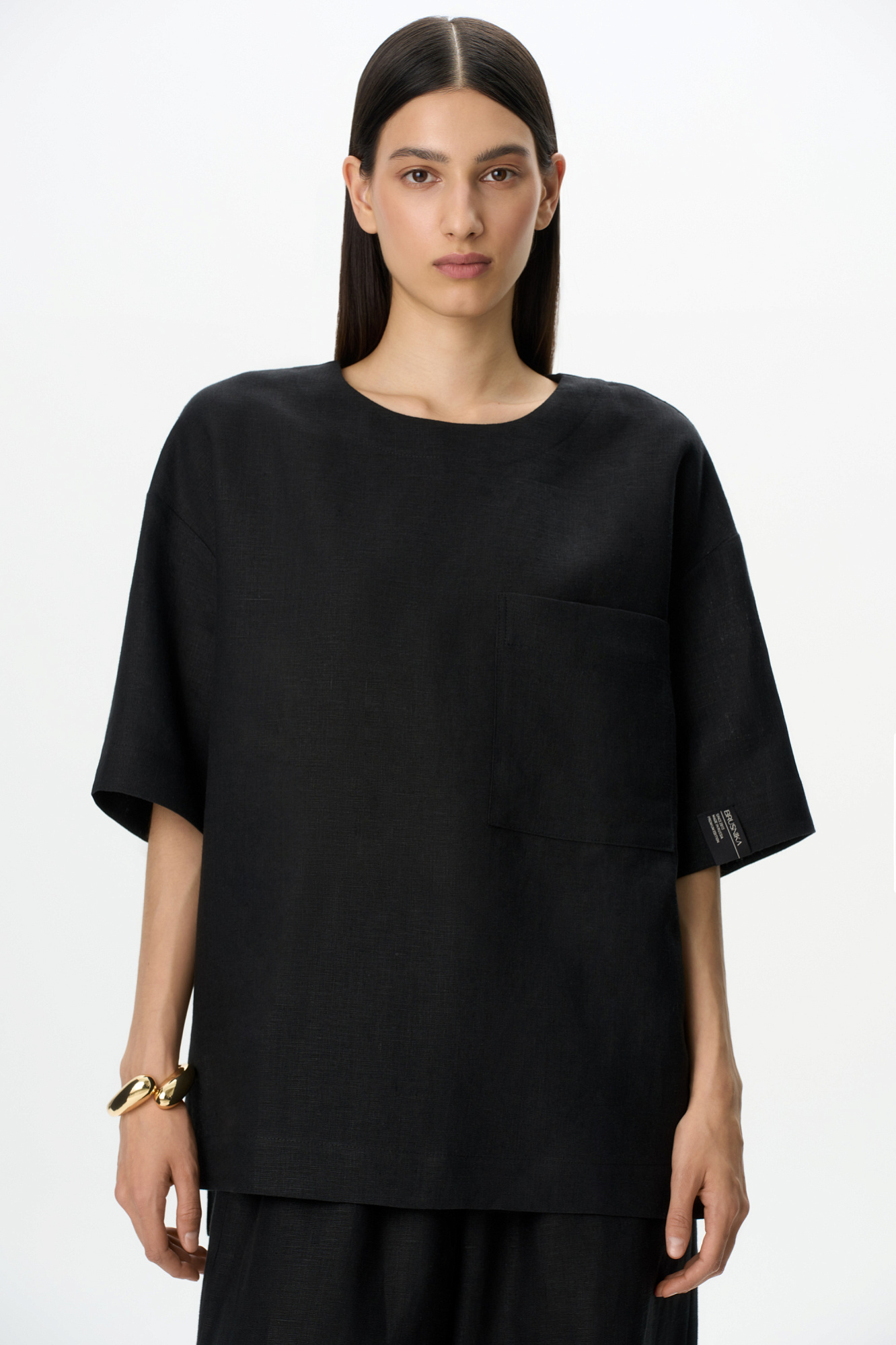 Широкая футболка из 100% льна. Модель прямого кроя, со спущенной линией плеча, круглым вырезом горловины и асимметричным низом с разрезами по бокам. Изделие декорировано накладным карманом на груди и брендированным ярлыком на рукаве. Застежка на пуговицу сзади.