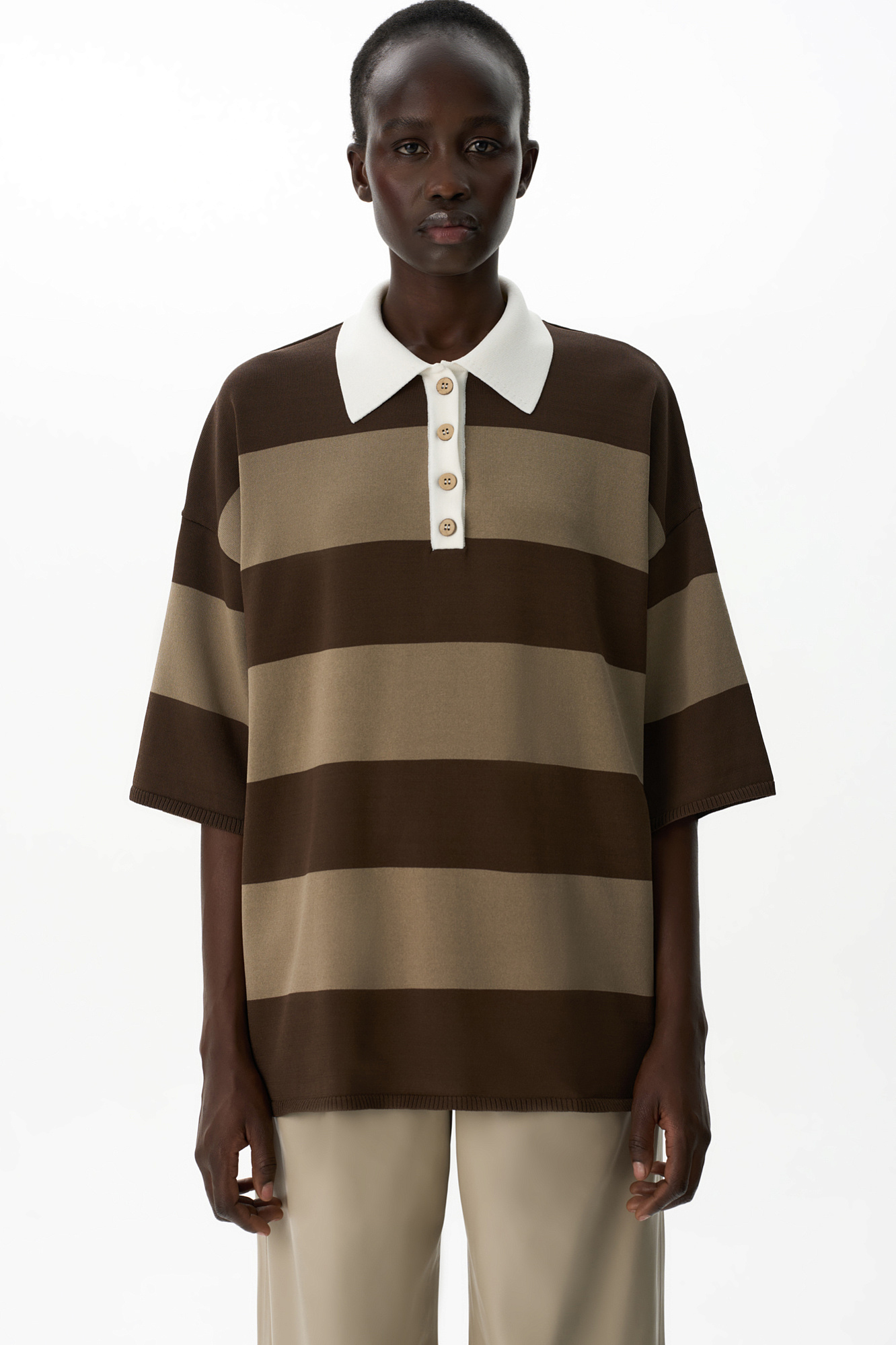 Трикотажная футболка поло из вискозы. Модель свободного кроя со спущенной линией плеч и отложным воротником с V-образным вырезом.