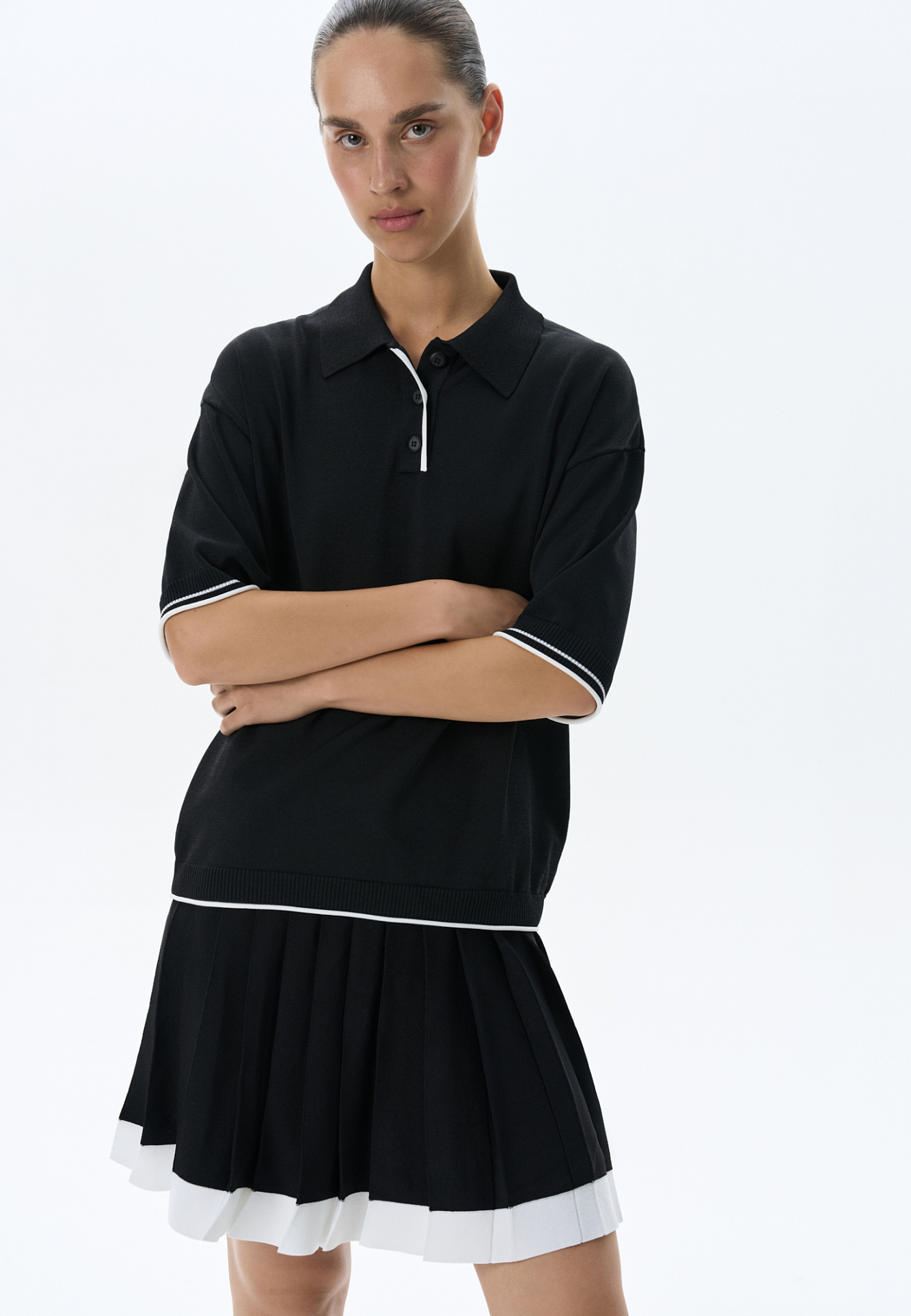 Трикотажная футболка поло из вискозы. Модель прямого силуэта, со спущенной линией плеч, короткими рукавами, отложным воротником-поло и планкой с тремя пуговицами. Рукава и нижний край изделия декорированы кантом контрастного цвета.