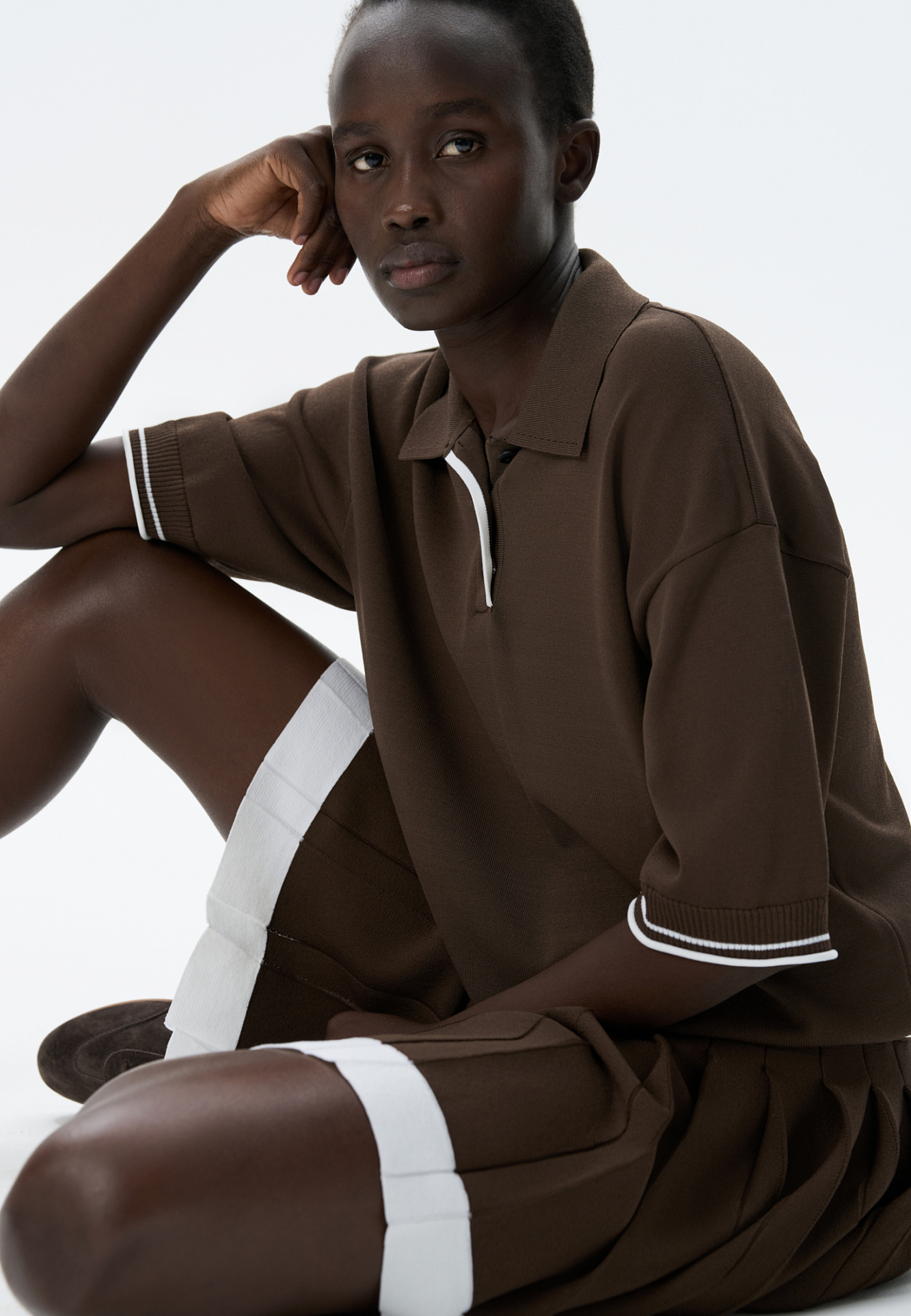 Трикотажная футболка поло из вискозы. Модель прямого силуэта, со спущенной линией плеч, короткими рукавами, отложным воротником-поло и планкой с тремя пуговицами. Рукава и нижний край изделия декорированы кантом контрастного цвета.