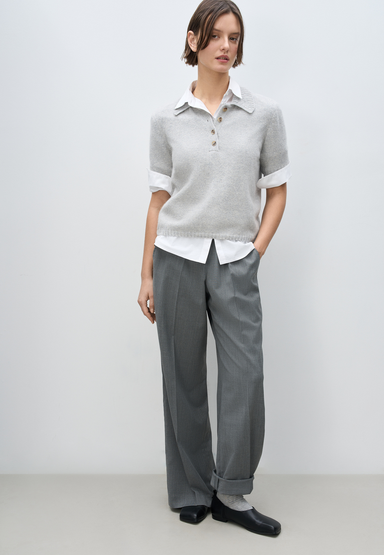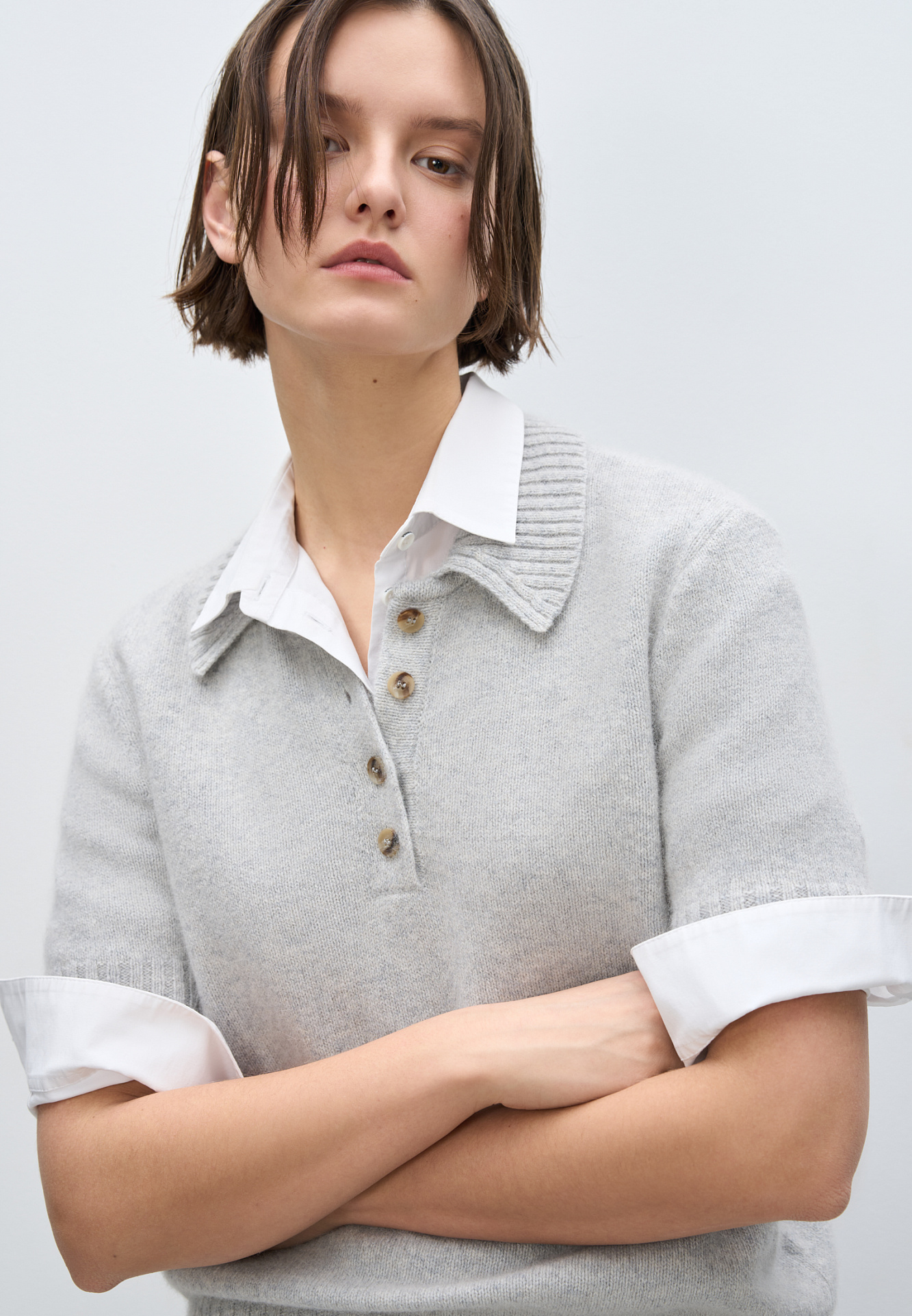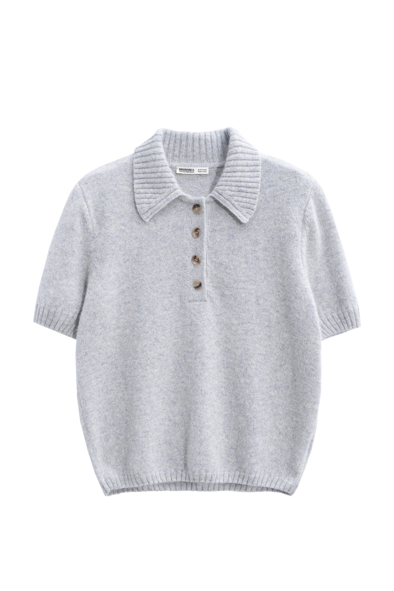 Трикотажная футболка из пуха лисы. Модель прямого силуэта с воротником-поло на пуговицах. Воротник и края изделия выполнены в рубчик.