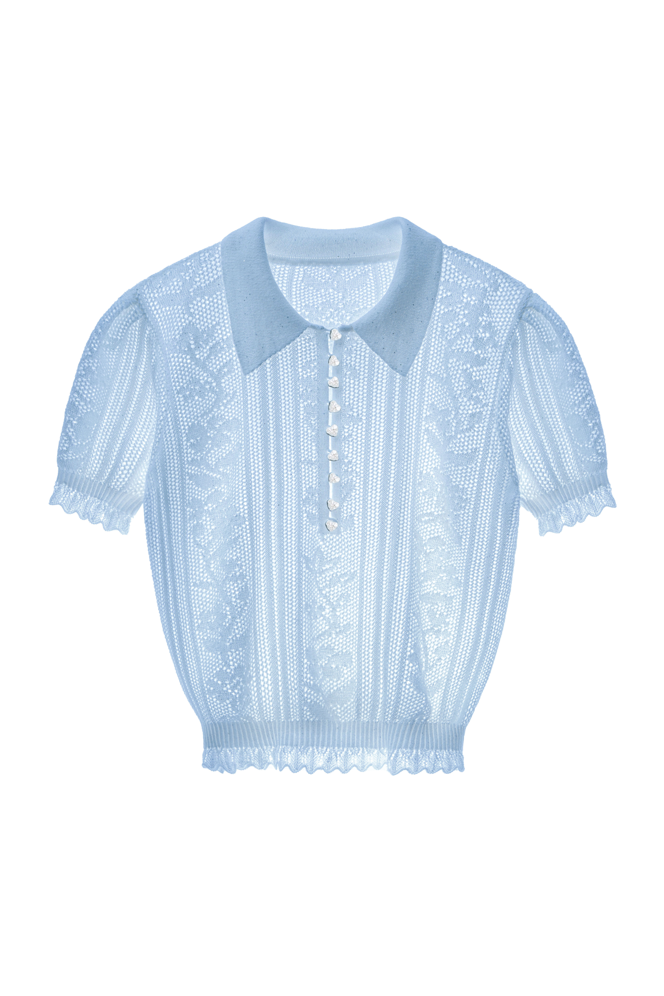 Трикотажная футболка из вискозы с пайетками. Изделие выполнено ажурным переплетением с дизайном в виде растительного орнамента. Модель с воротником-поло, планкой на пуговицах-сердечках и коротким рукавом.
