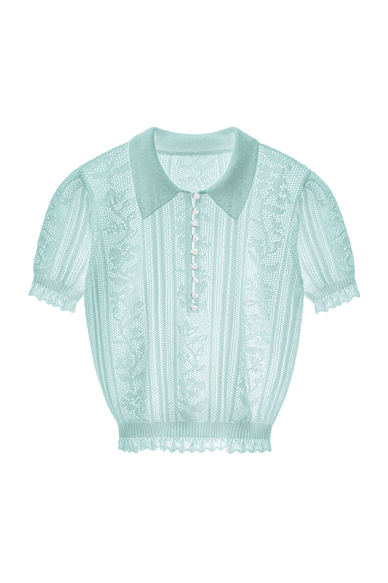 Трикотажная футболка из вискозы с пайетками. Изделие выполнено ажурным переплетением с дизайном в виде растительного орнамента. Модель с воротником поло, планкой на пуговицах-сердечках и коротким рукавом.