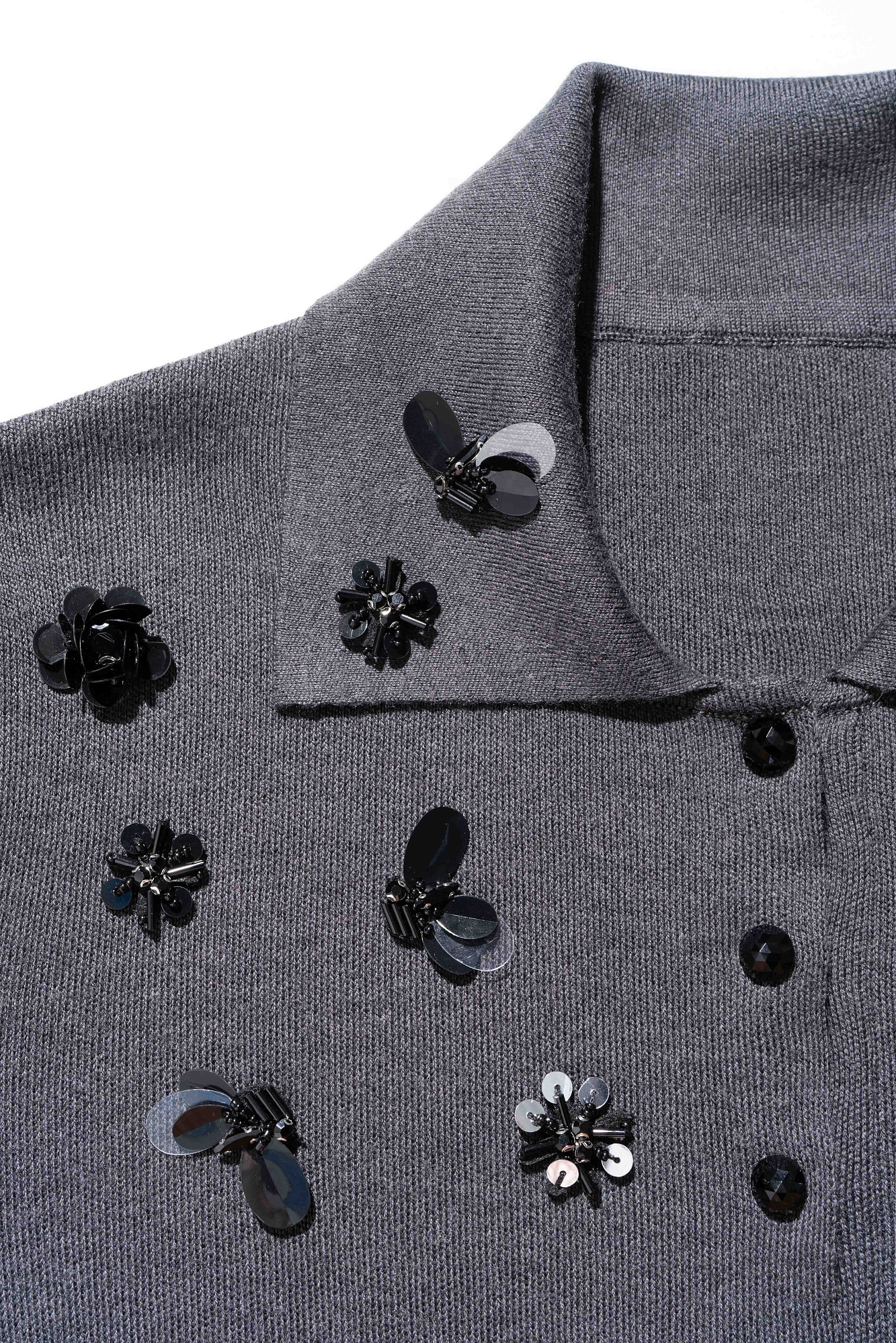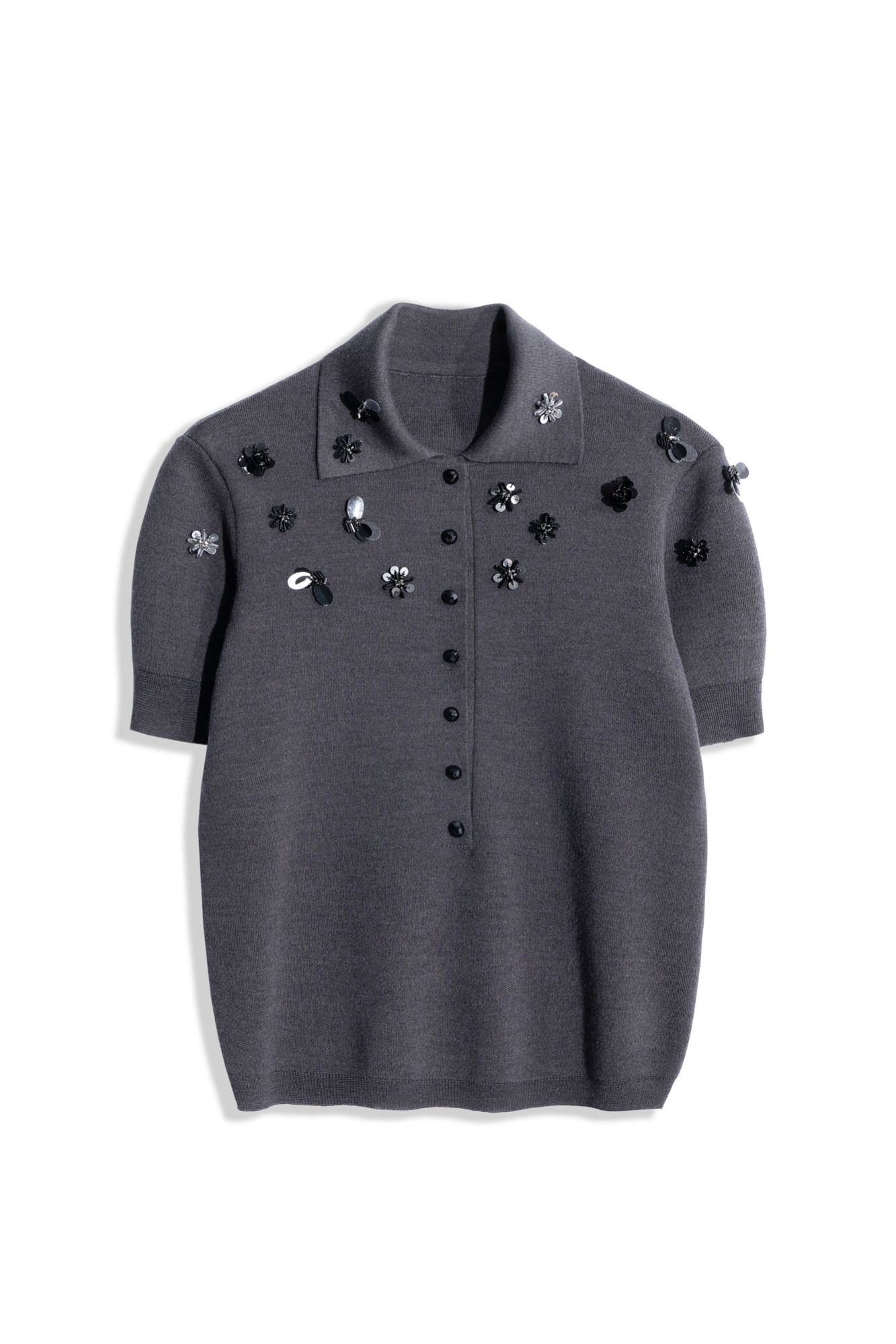 Трикотажная футболка поло из шерсти. Модель свободного силуэта с воротником поло и низкой планкой на пуговицах. Изделие декорировано цветами из бисера и пайеток.