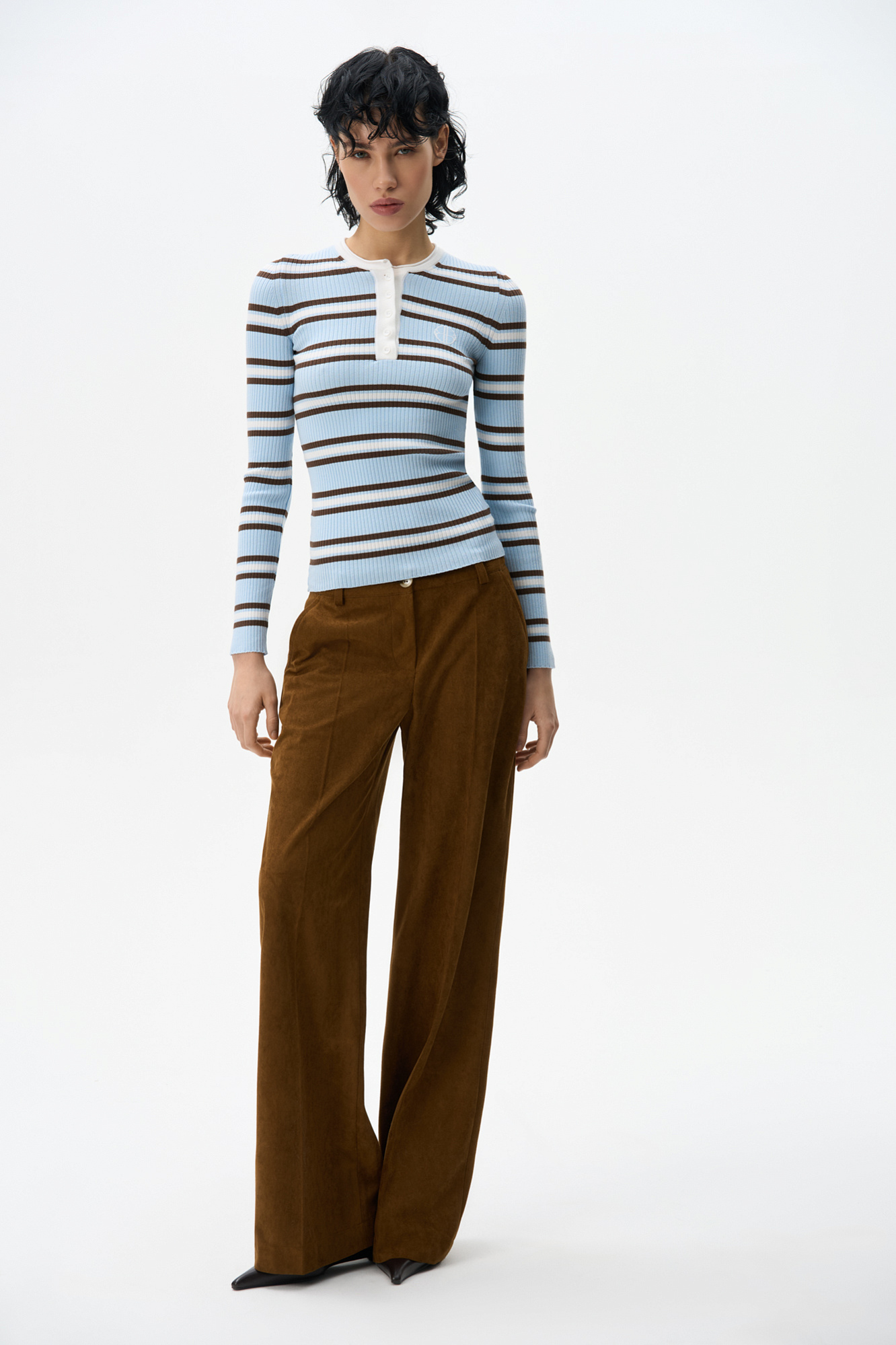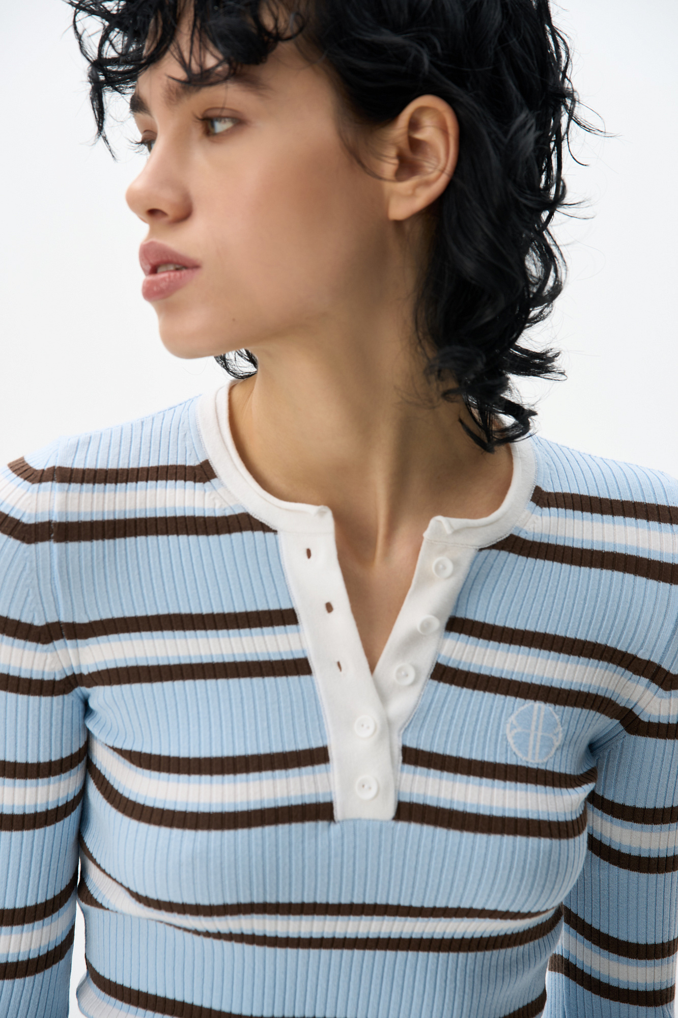 Трикотажный лонгслив из вискозы. Модель с круглым вырезом горловины с планкой на пуговицах и брендированным ярлыком на груди.