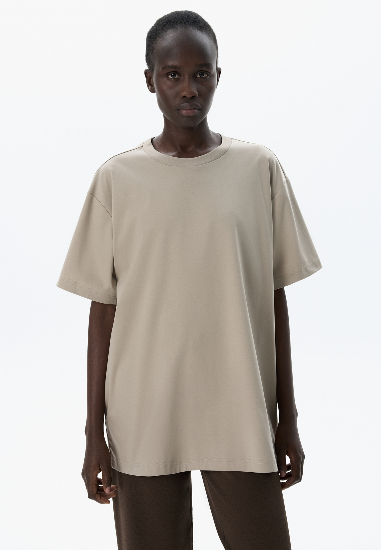 Футболка из 100% хлопка. Модель свободного силуэта, с круглым вырезом горловины и спущенной линией плеча.