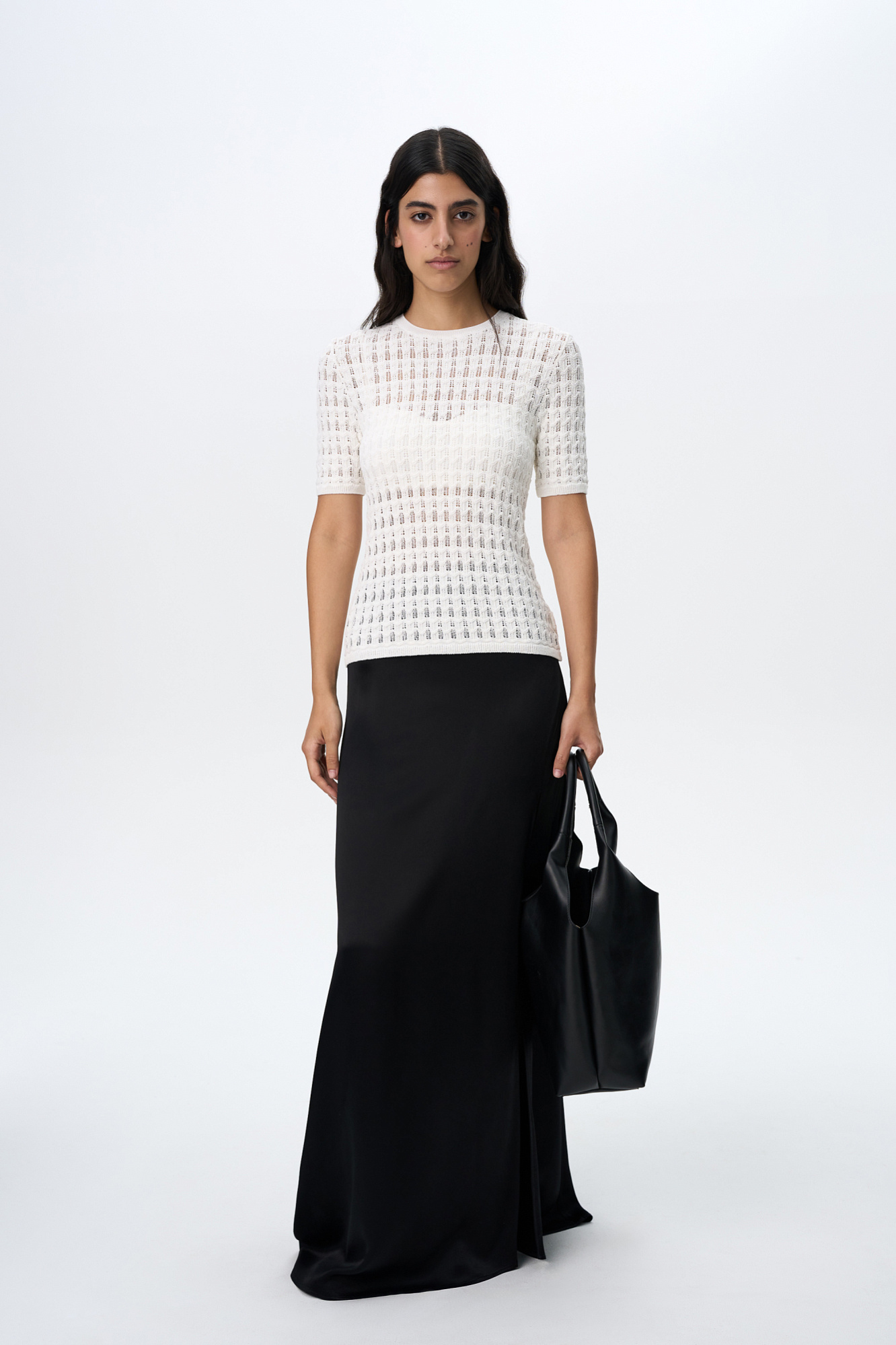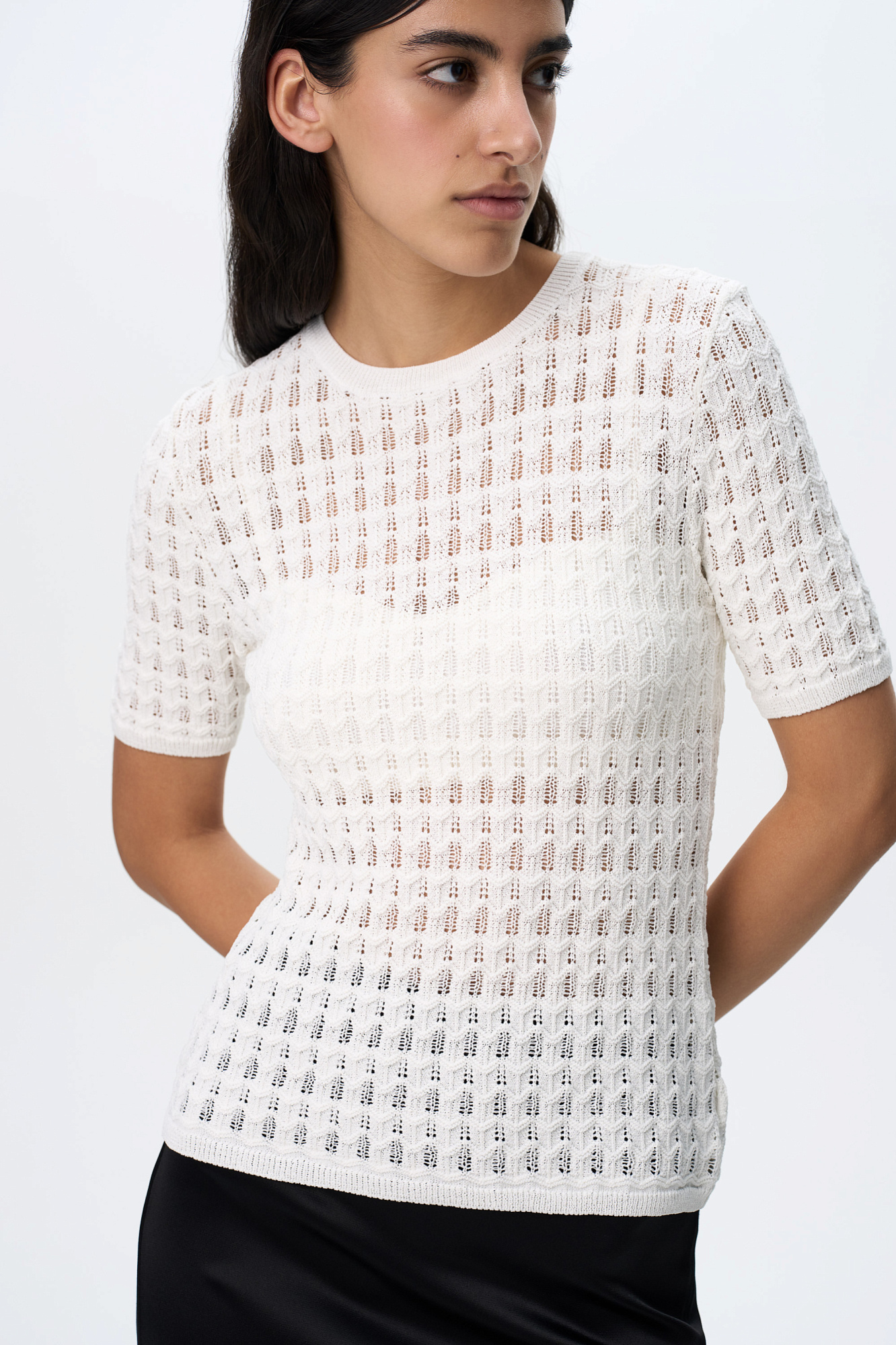 Трикотажная футболка из вискозы. Модель приталенного силуэта, с коротким рукавом, спущенной линией плеча и круглым вырезом горловины. Модель выполнена ажурным переплетением.