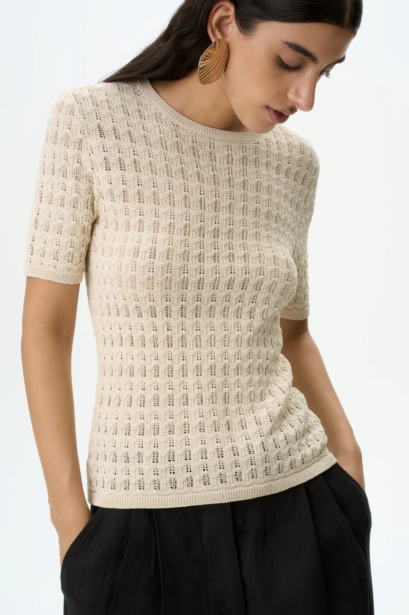 Трикотажная футболка из вискозы. Модель приталенного силуэта, с коротким рукавом, спущенной линией плеча и круглым вырезом горловины. Модель выполнена ажурным переплетением.